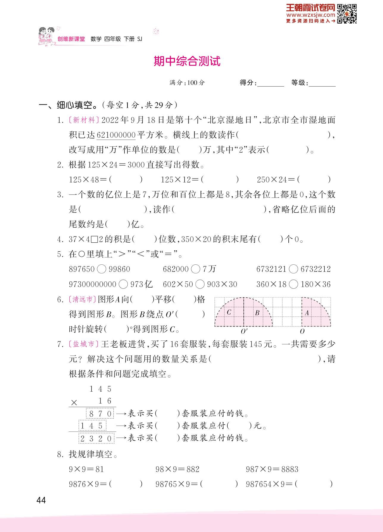 2023下册四年级数学苏教版 期中综合测试