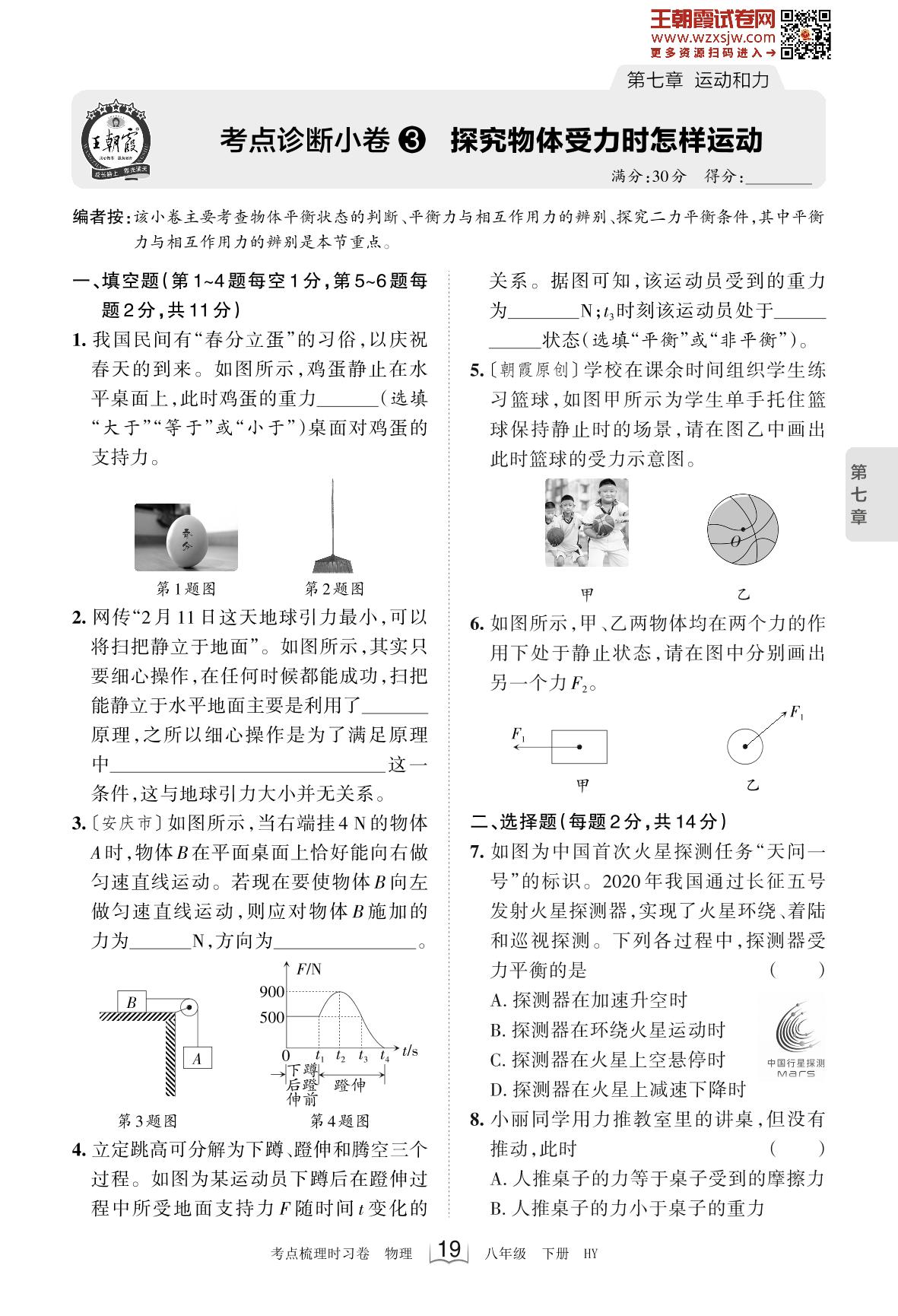 2023下册八年级物理沪粤版 第七章 考点诊断小卷3 探究物体受力时怎样运动