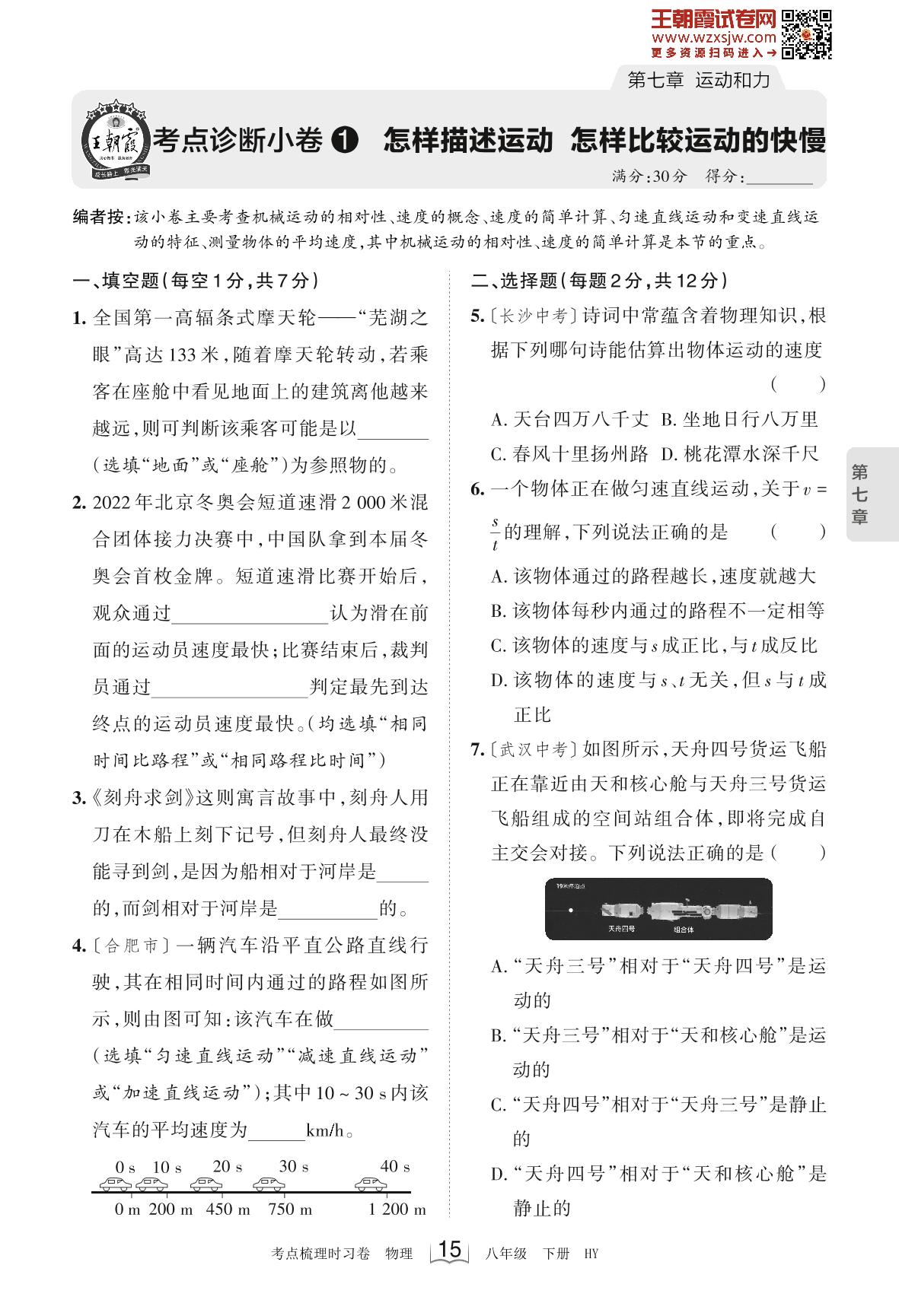 2023下册八年级物理沪粤版 第七章 考点诊断小卷1 怎样描述运动 怎样比较运动的快慢