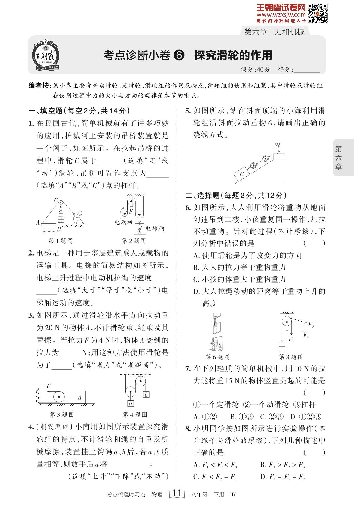 2023下册八年级物理沪粤版 第六章 考点诊断小卷6 探究滑轮的作用