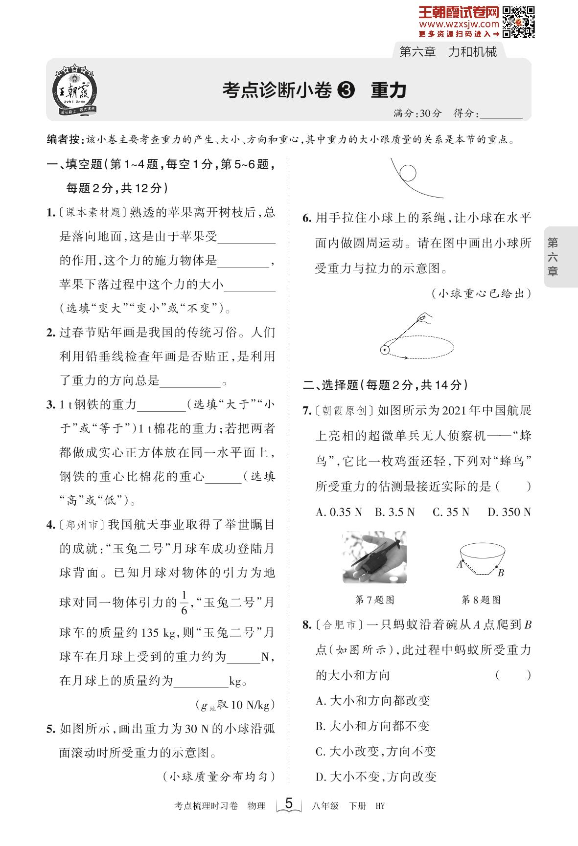 2023下册八年级物理沪粤版 第六章 考点诊断小卷3 重力