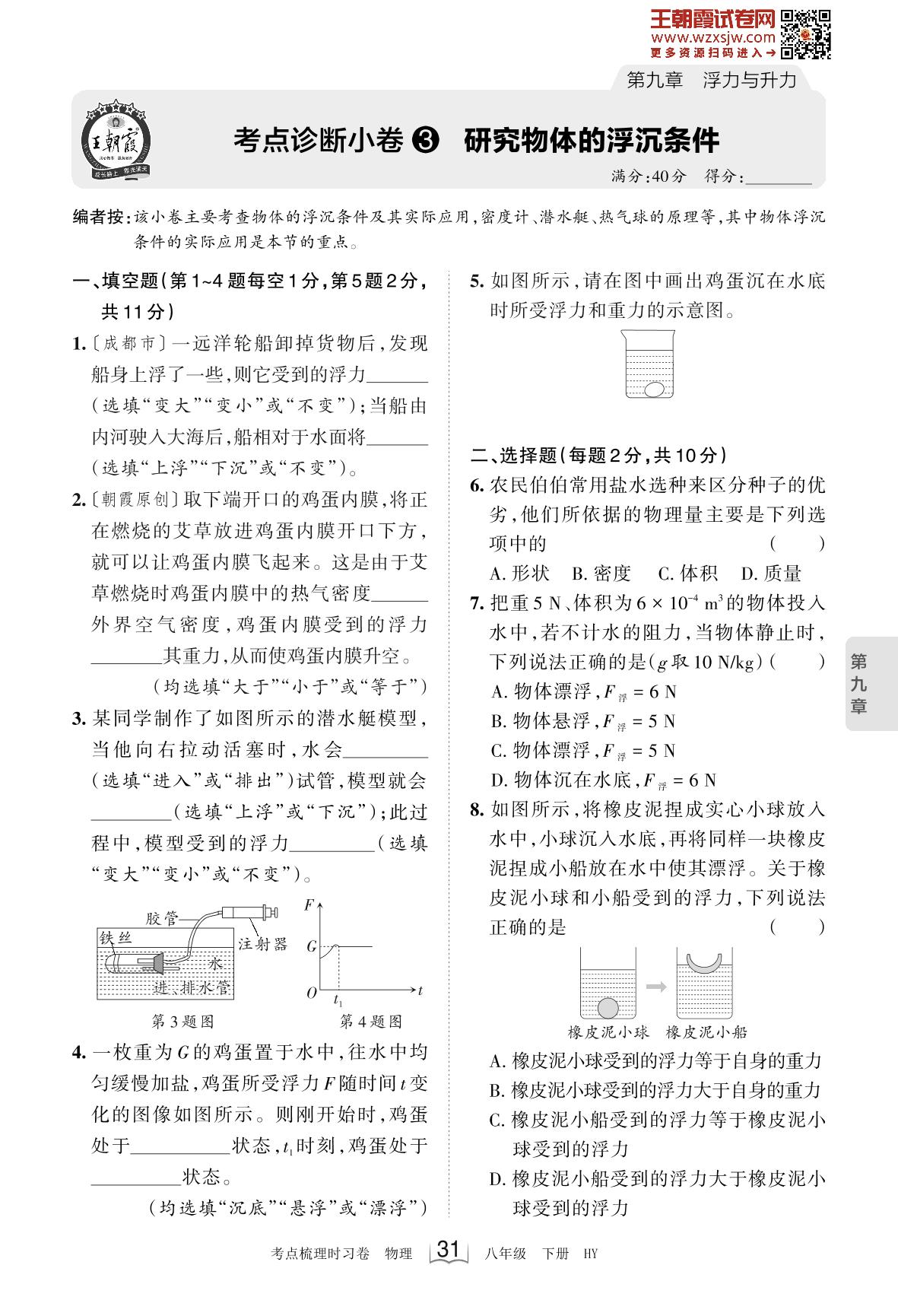 2023下册八年级物理沪粤版 第九章 考点诊断小卷3 研究物体的浮沉条件