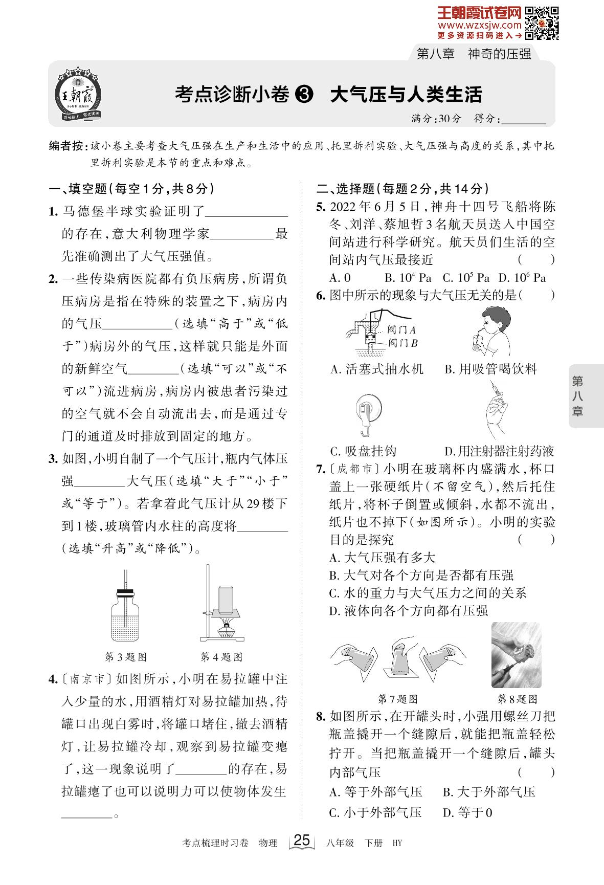 2023下册八年级物理沪粤版 第八章 考点诊断小卷3 大气压与人类生活