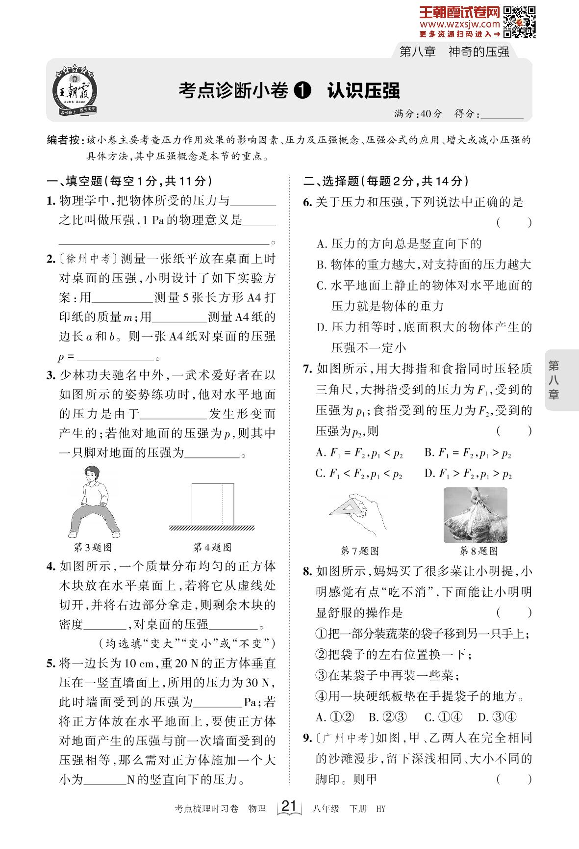 2023下册八年级物理沪粤版 第八章 考点诊断小卷1 认识压强