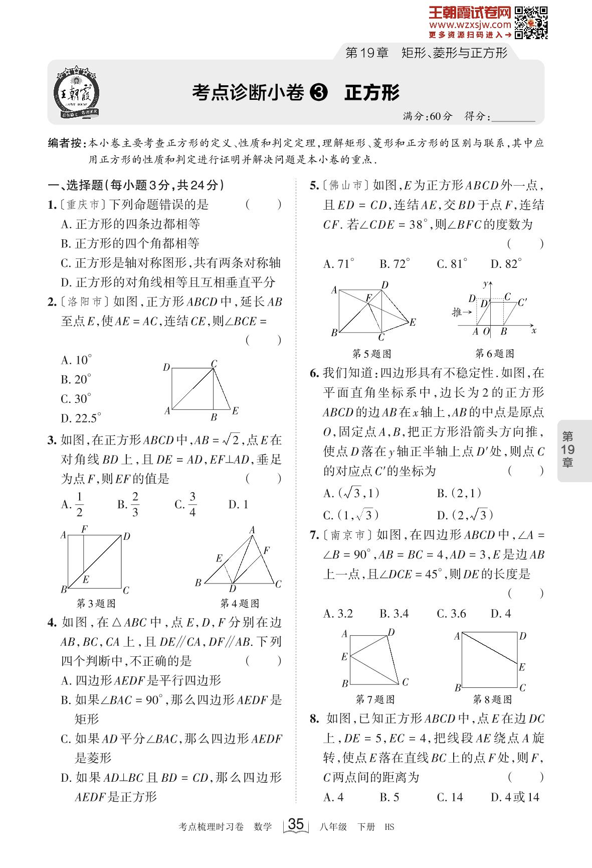 2023下册八年级数学华师版 第19章 考点诊断小卷3 正方形