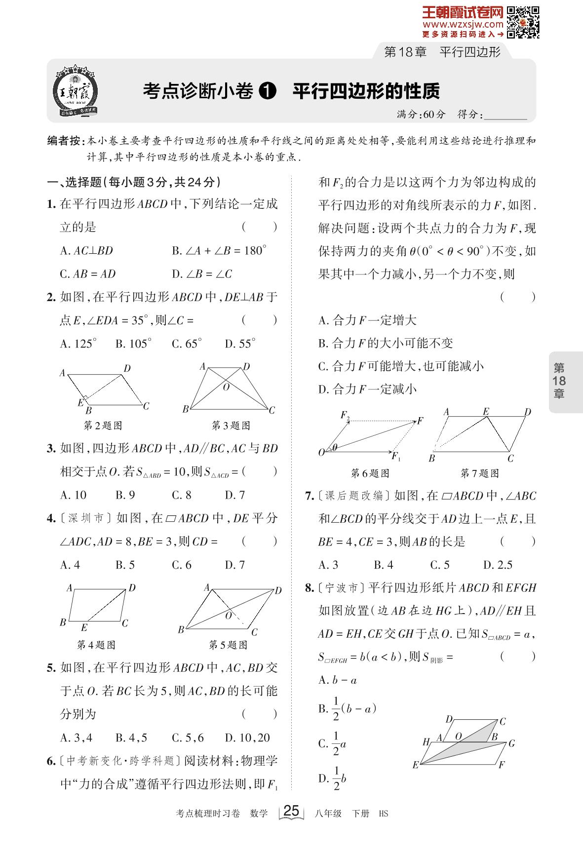 2023下册八年级数学华师版 第18章 考点诊断小卷1 平行四边形的性质