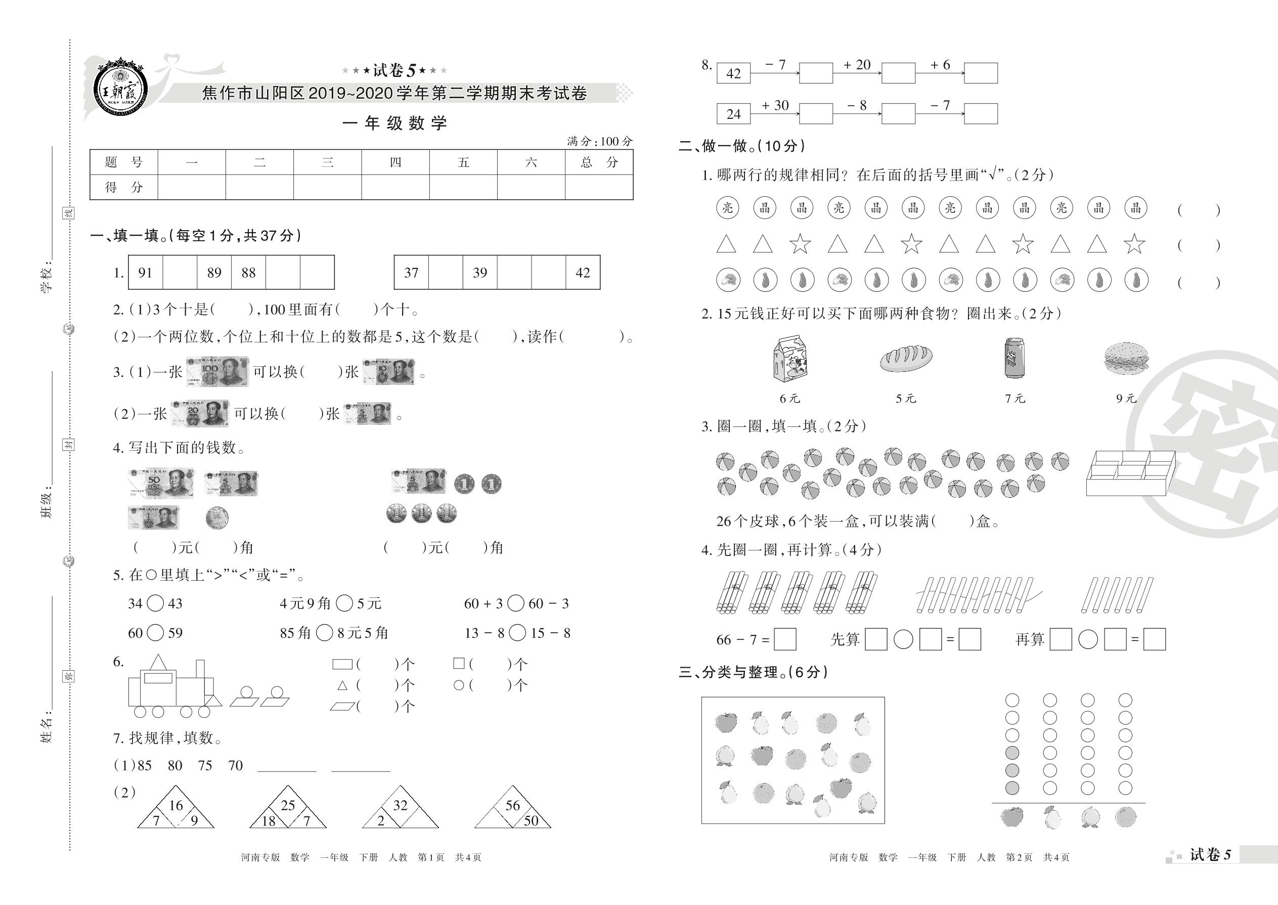 2019-2020学年第二学期焦作市山阳区一年级数学试卷(人教版)【5】