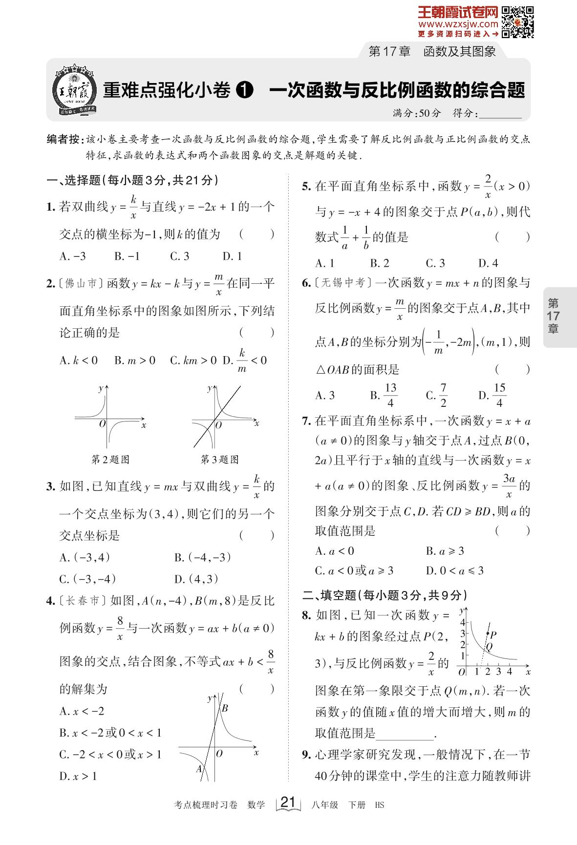 2023下册八年级数学华师版 第17章 重难点强化小卷1 一次函数与反比例函数的综合题