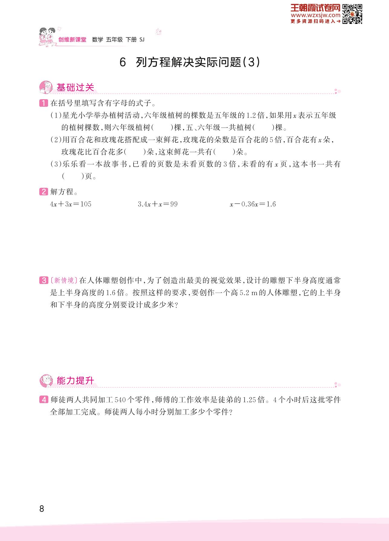 2023下册五年级数学苏教版 一 简易方程——6 列方程解决实际问题(3)