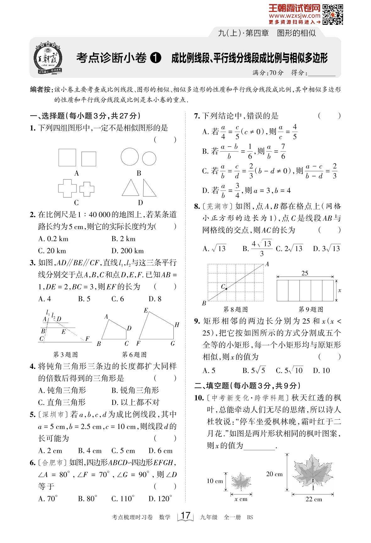 2023上册九年级数学北师版 第四章 考点诊断小卷1 成比例线段、平行线分线段成比例与相似多边形