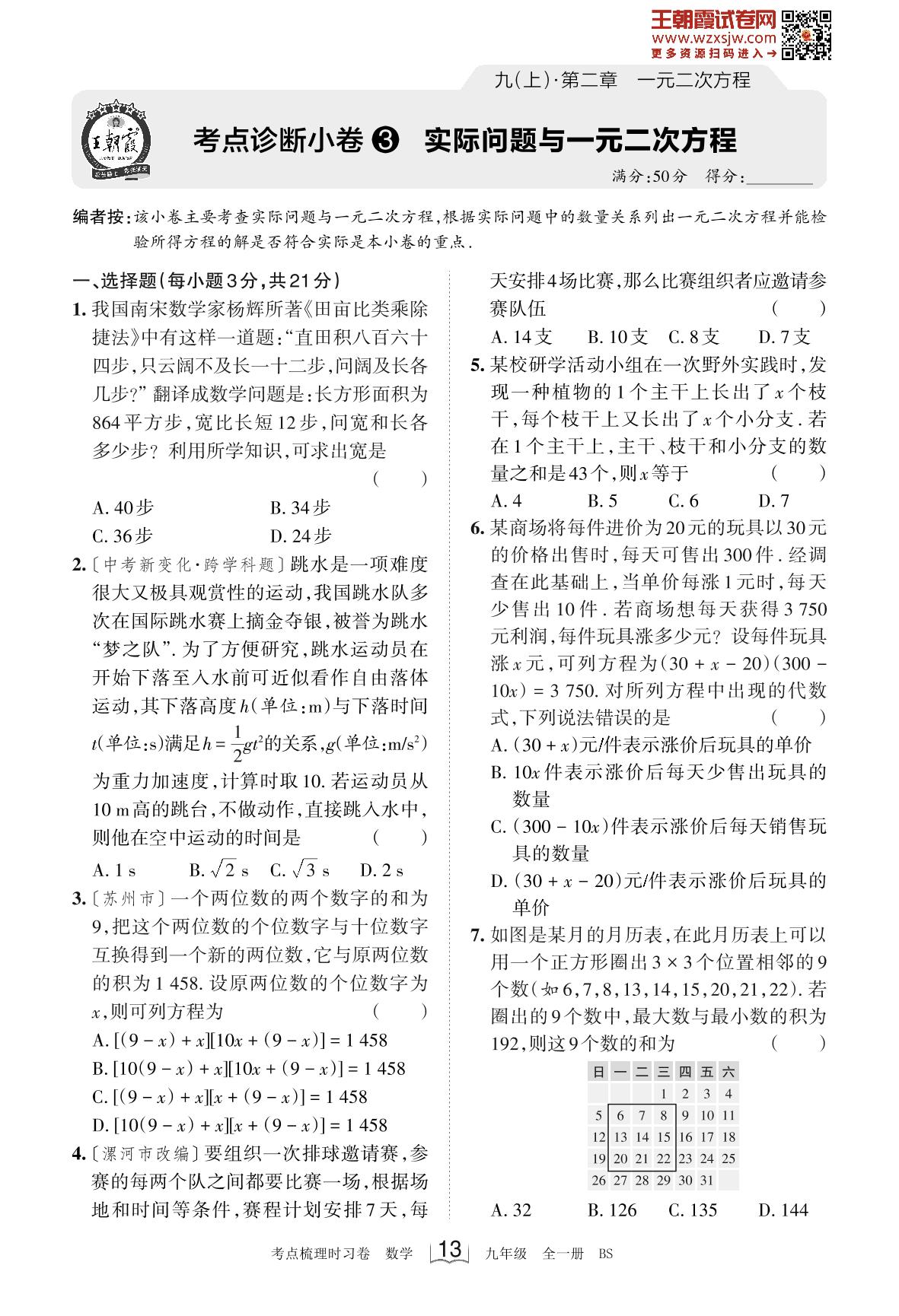 2023上册九年级数学北师版 第二章 考点诊断小卷3 实际问题与一元二次方程