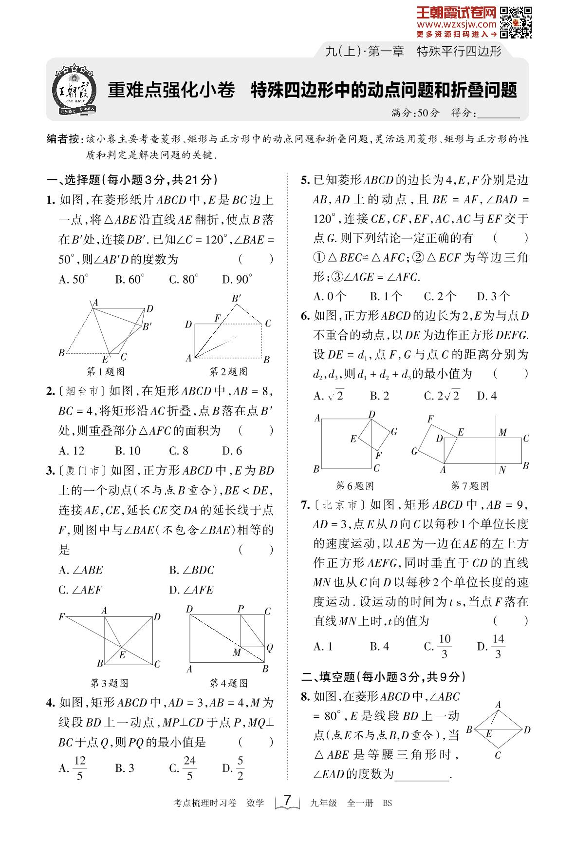 2023上册九年级数学北师版 第一章 重难点强化小卷 特殊四边形中的动点问题和折叠问题