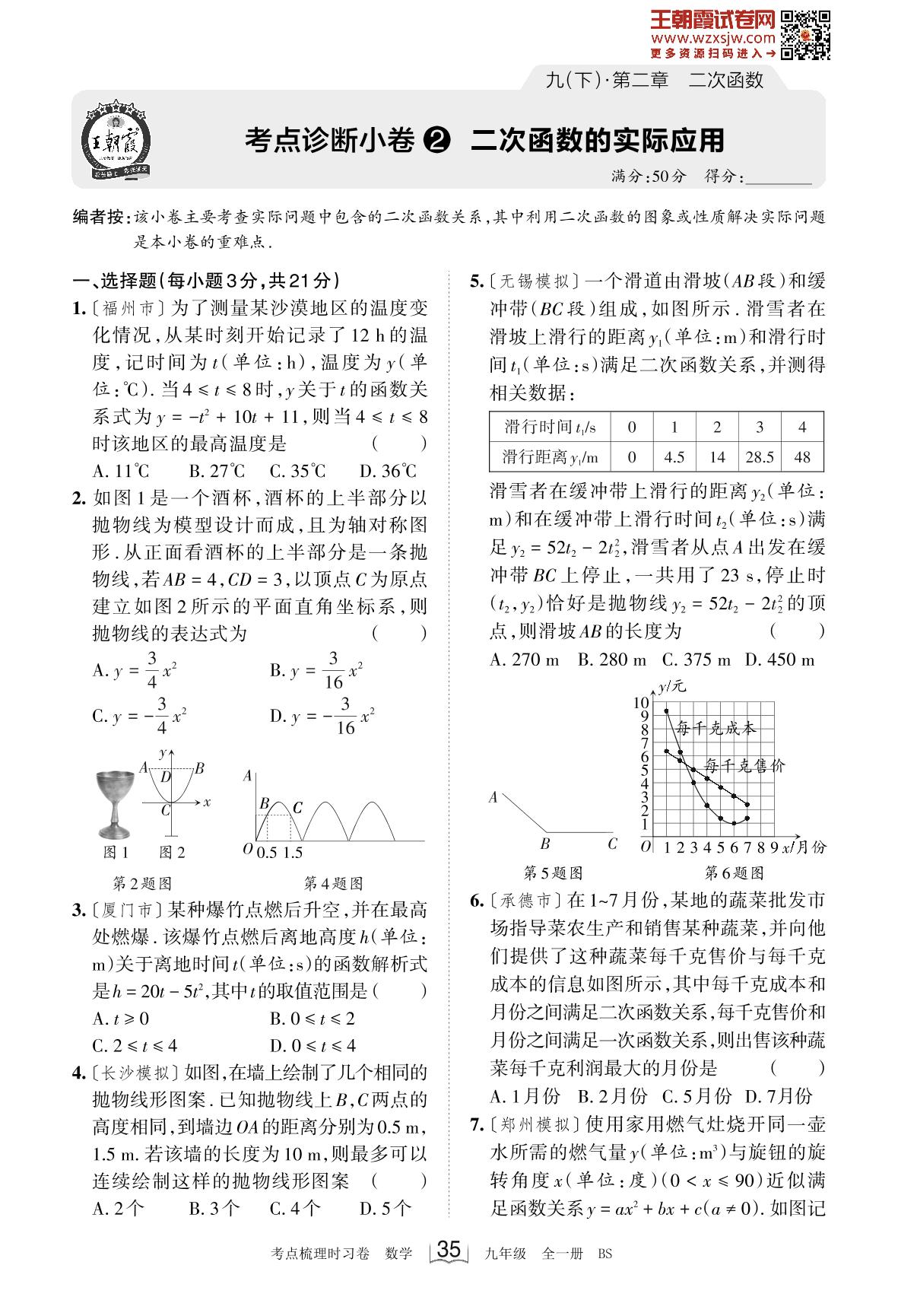 2024下册九年级数学北师版 第二章 考点诊断小卷2 二次函数的实际应用
