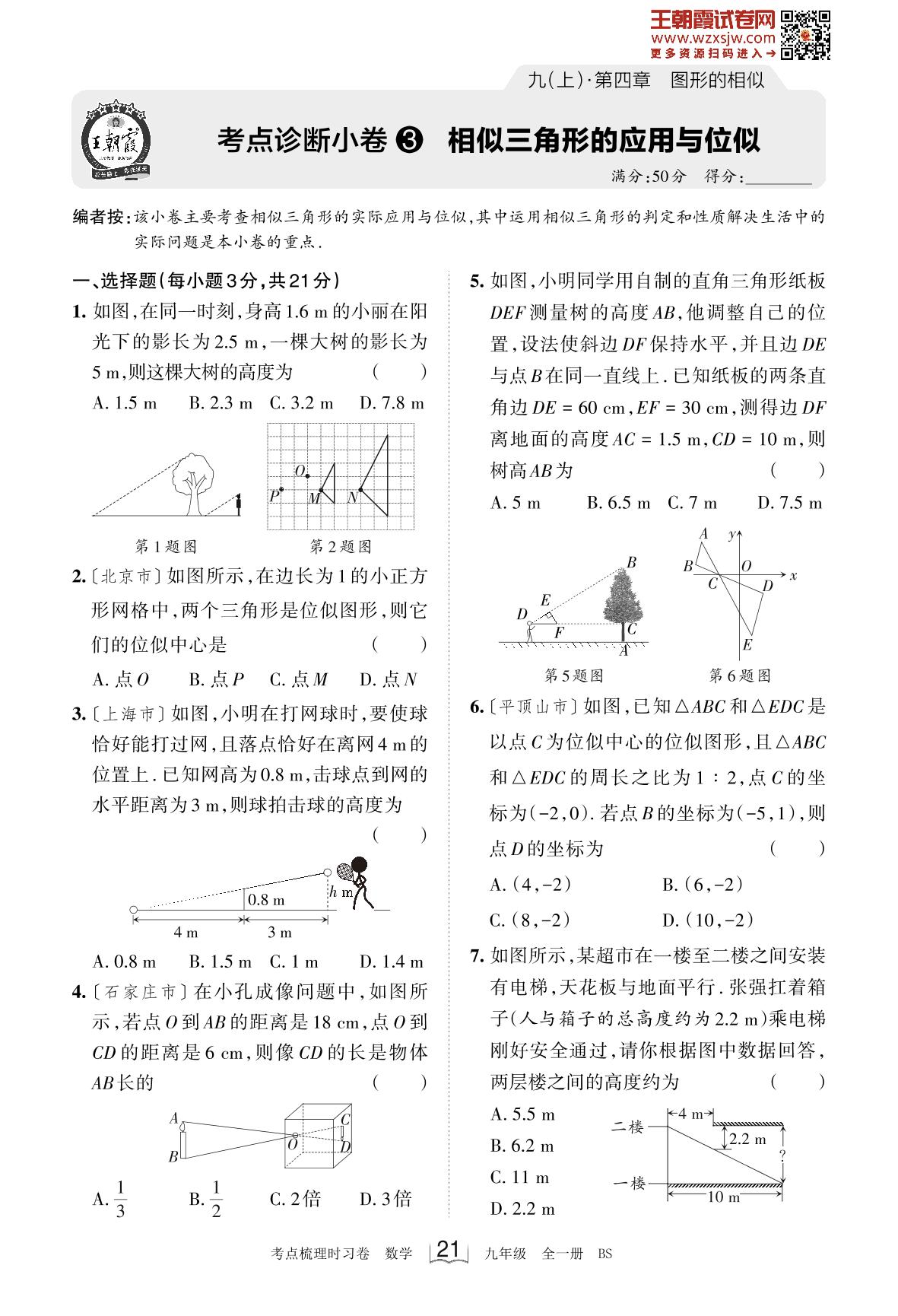 2023上册九年级数学北师版 第四章 考点诊断小卷3 相似三角形的应用与位似