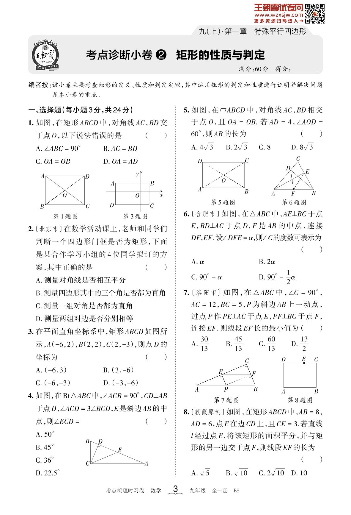 2023上册九年级数学北师版 第一章 考点诊断小卷2 矩形的性质与判定