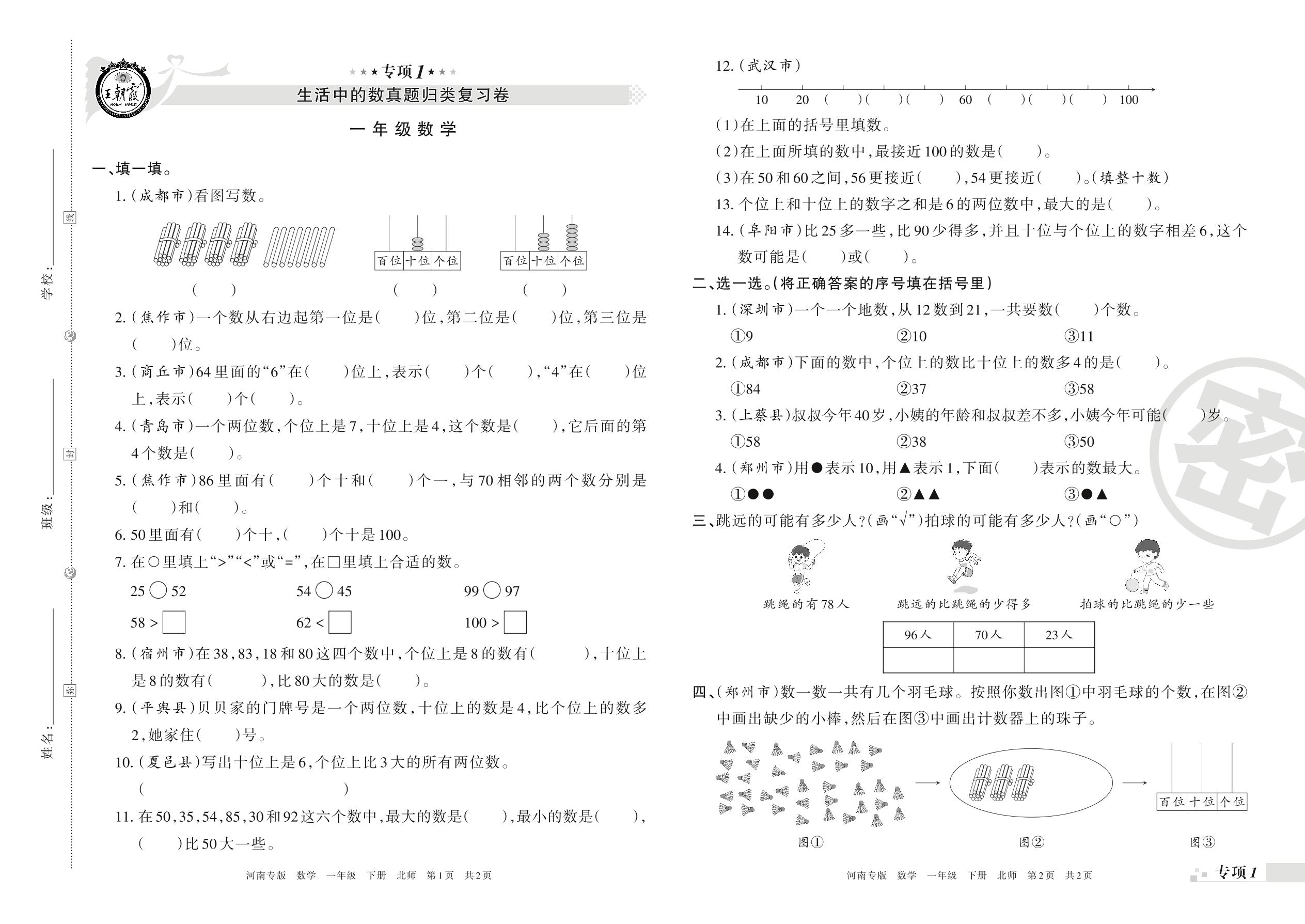 王朝霞期末专项卷——生活中的数、两位数加减一、两位数(不进退位)的计算真题归类复习一年级下册数学(北师版)【0】