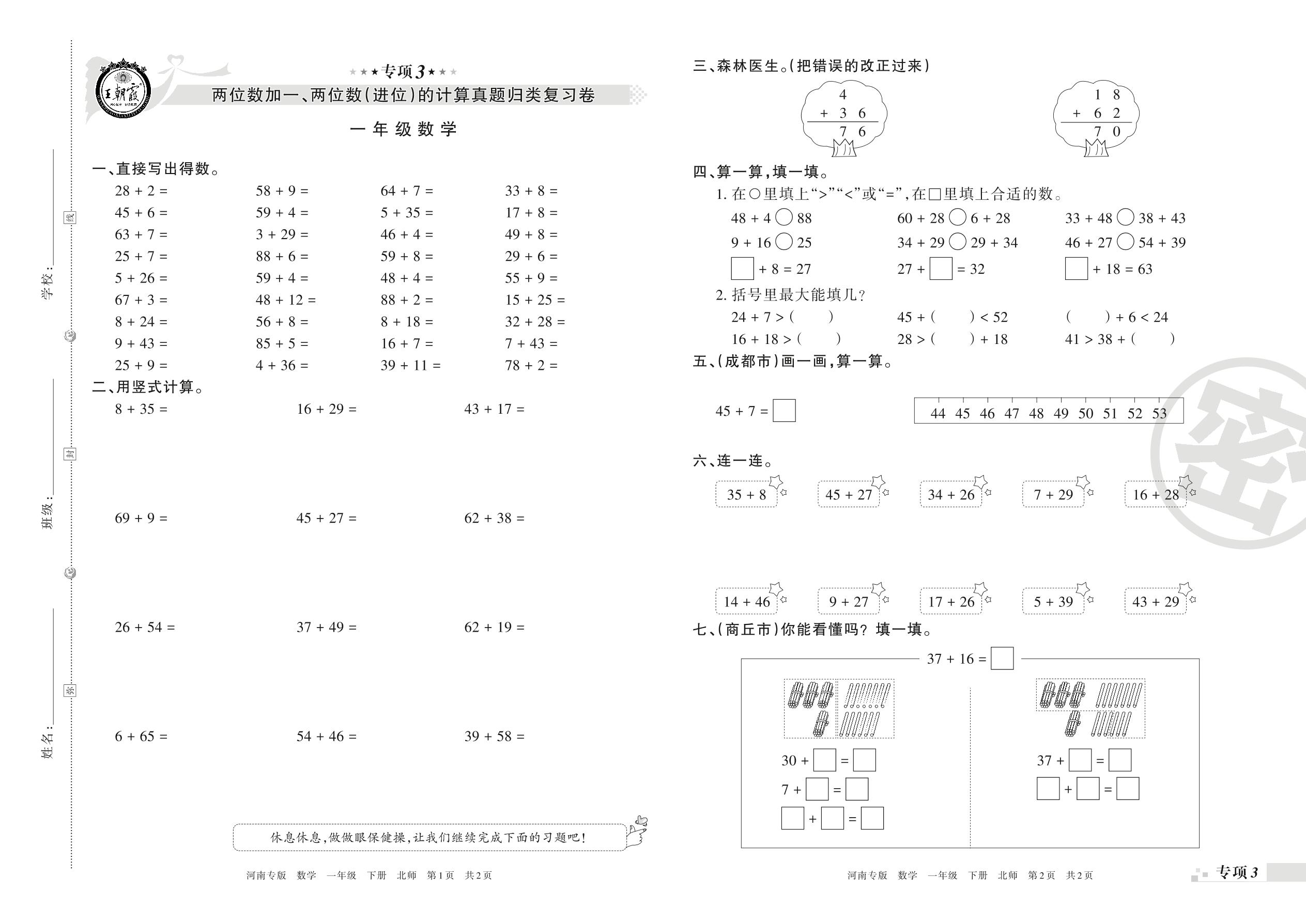 王朝霞期末专项卷——两位数加一、两位数(进位)的计算、两位数减一、两位数(退位)的计算真题归类复习一年级下册数学(北师版)【0】