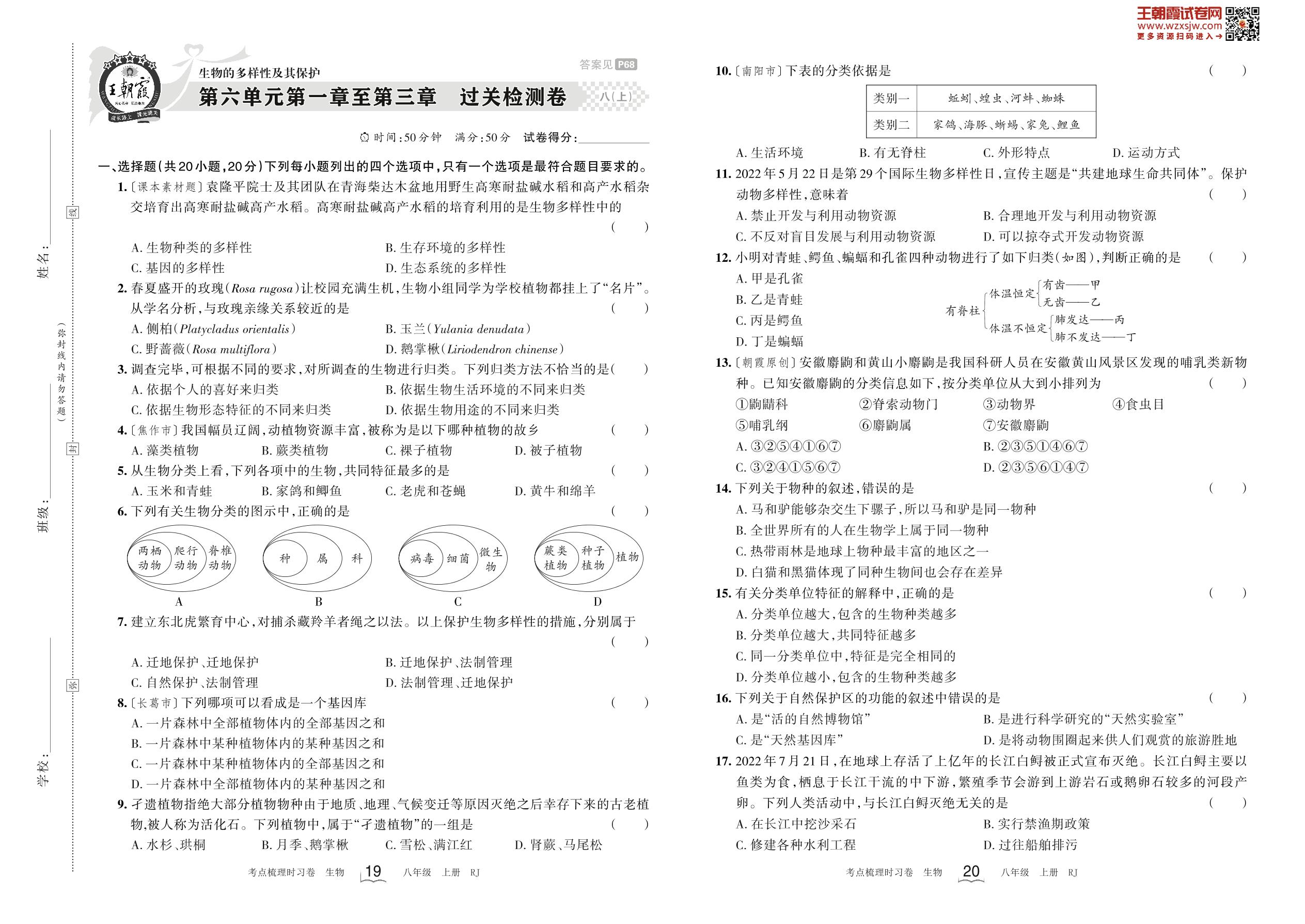 2023上册八年级生物人教版 第六单元第一章至第三章 过关检测卷