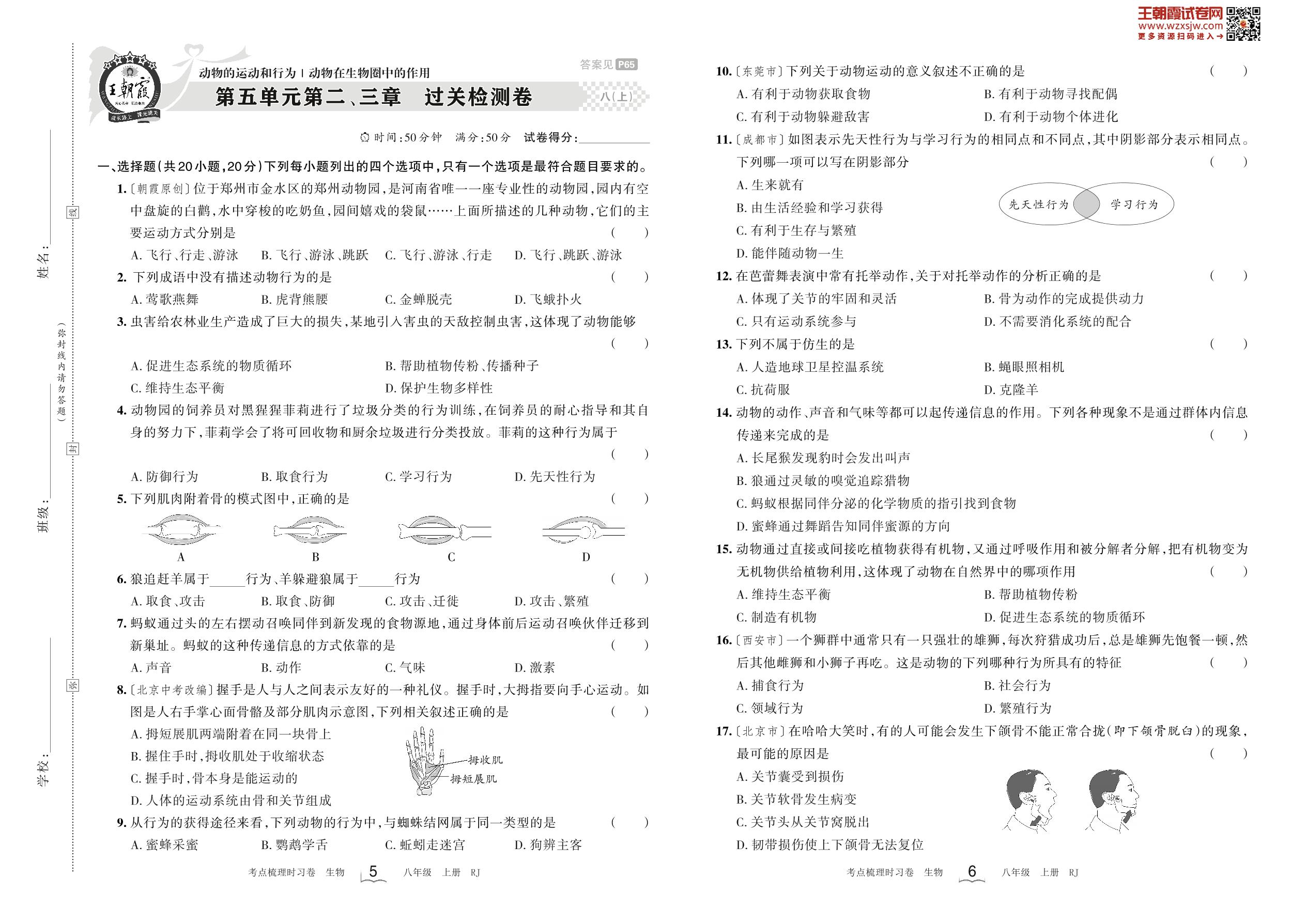 2023上册八年级生物人教版 第五单元第二、三章 过关检测卷