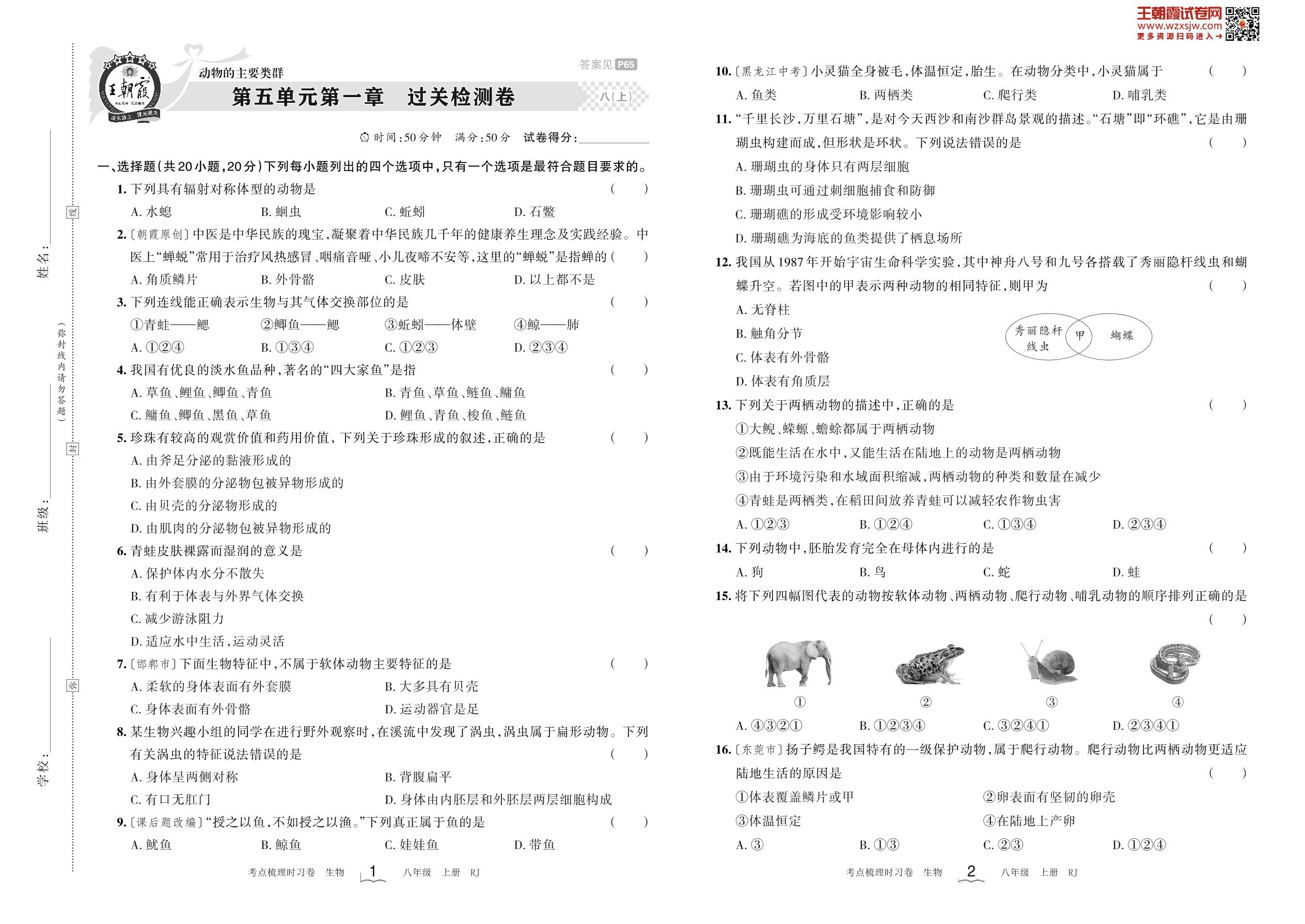 2023上册八年级生物人教版 第五单元第一章 过关检测卷