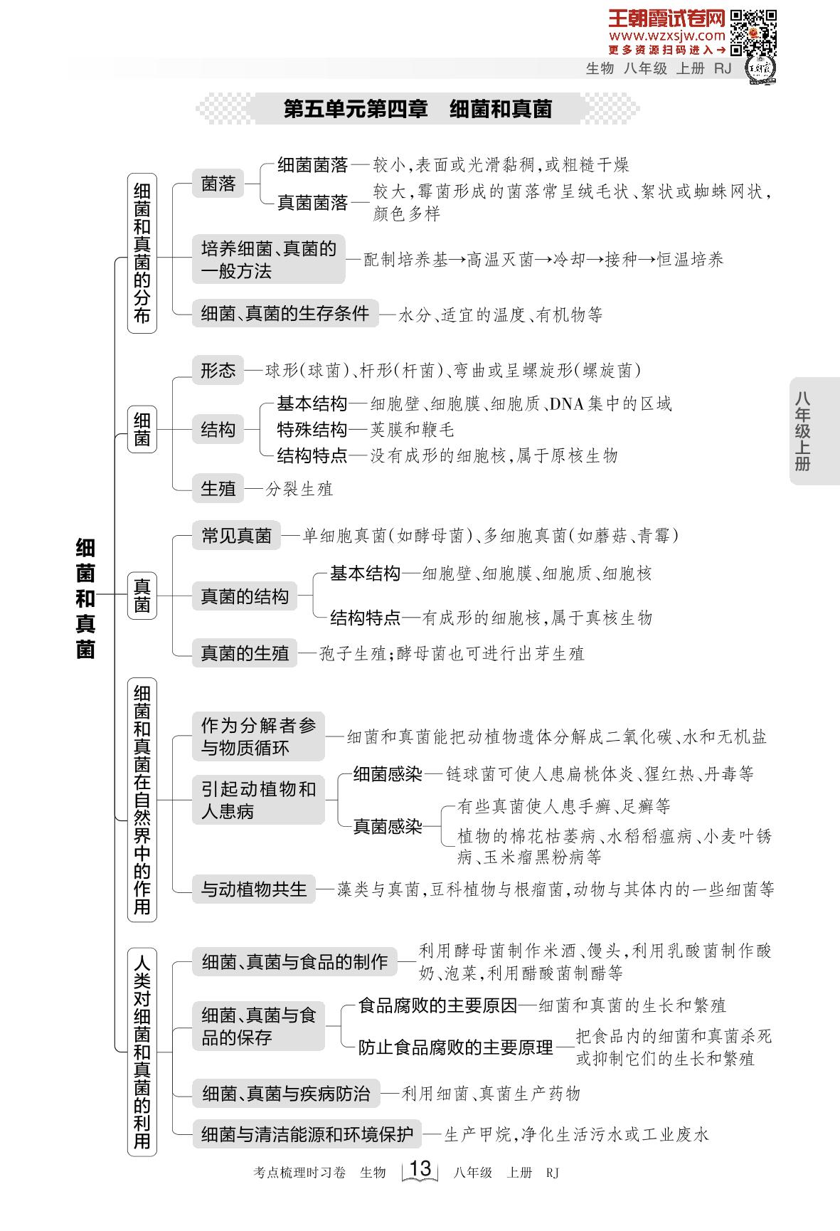 2023上册八年级生物人教版 考点梳理手册——第五单元第四章 细菌和真菌