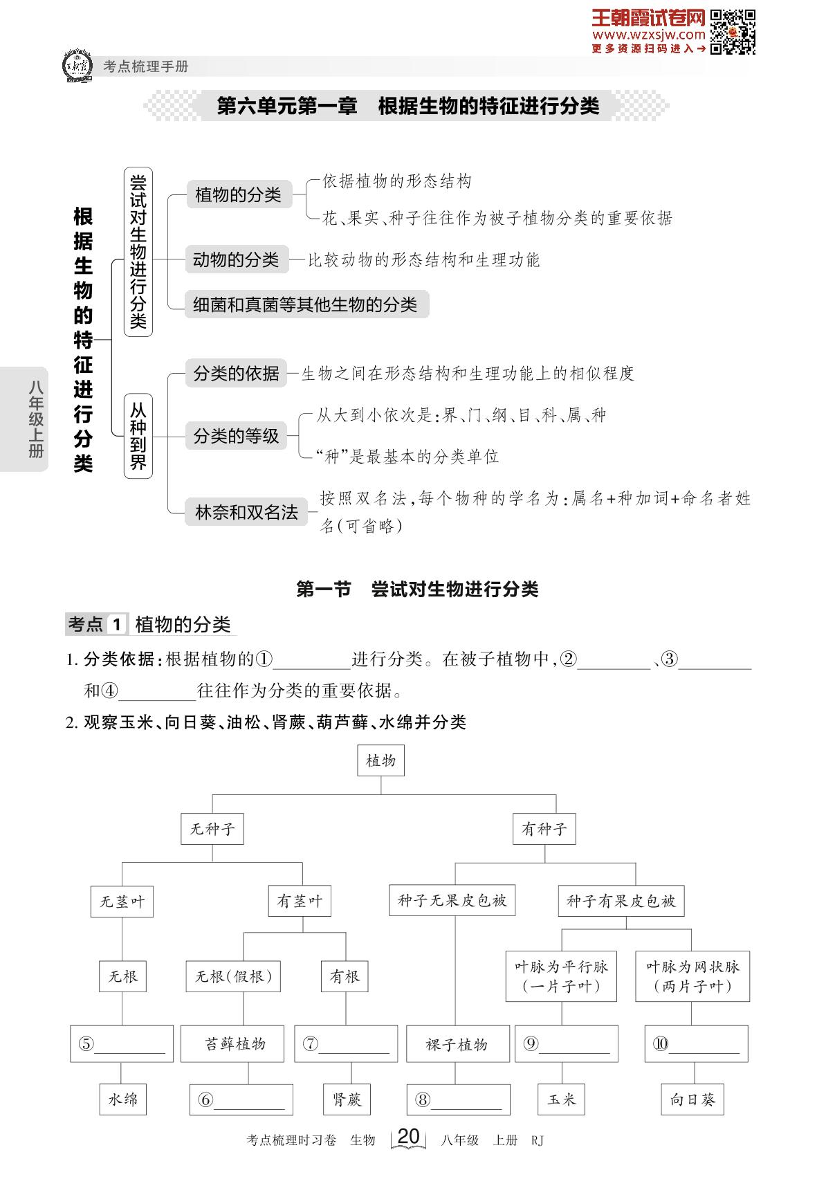 2023上册八年级生物人教版 考点梳理手册——第六单元第一章 根据生物的特征进行分类