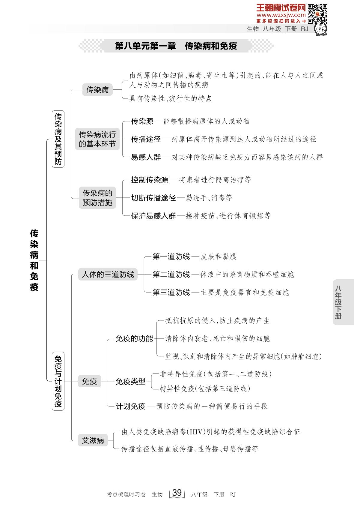 2024下册八年级生物人教版 考点梳理手册——第八单元第一章 传染病和免疫