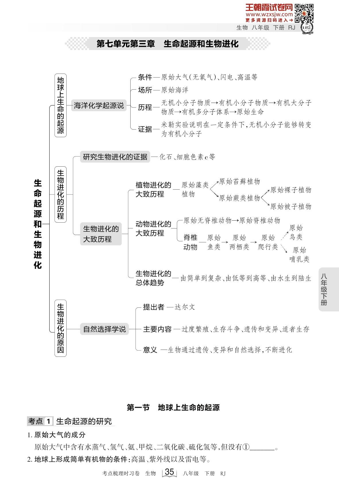 2024下册八年级生物人教版 考点梳理手册——第七单元第三章 生命起源和生物进化