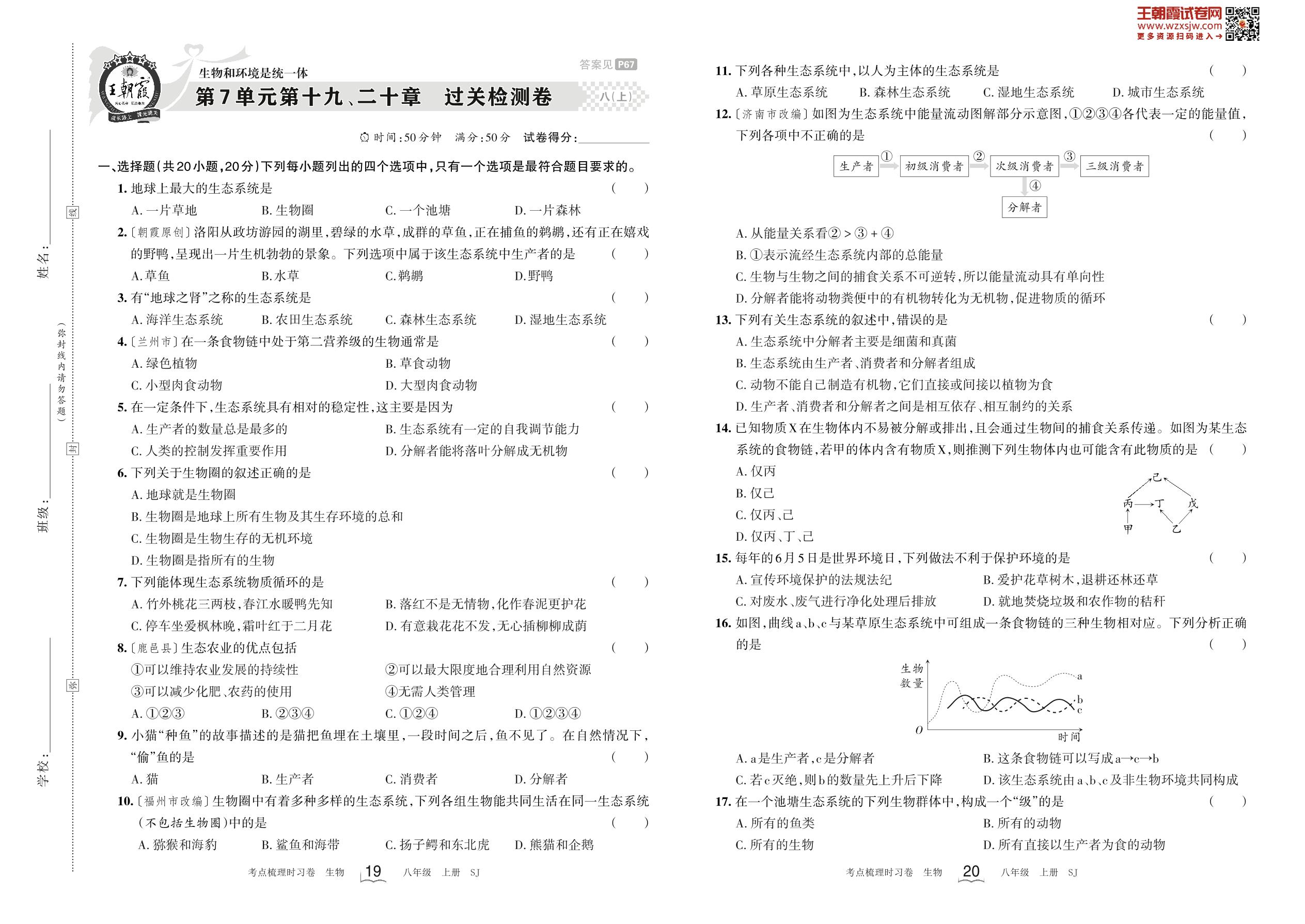 2023上册八年级生物苏教版 第7单元第十九、二十章 过关检测卷