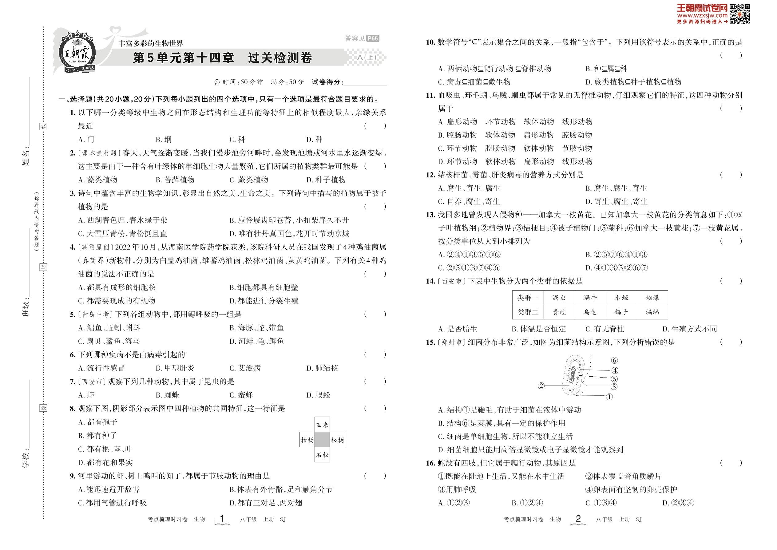 2023上册八年级生物苏教版 第5单元第十四章 过关检测卷