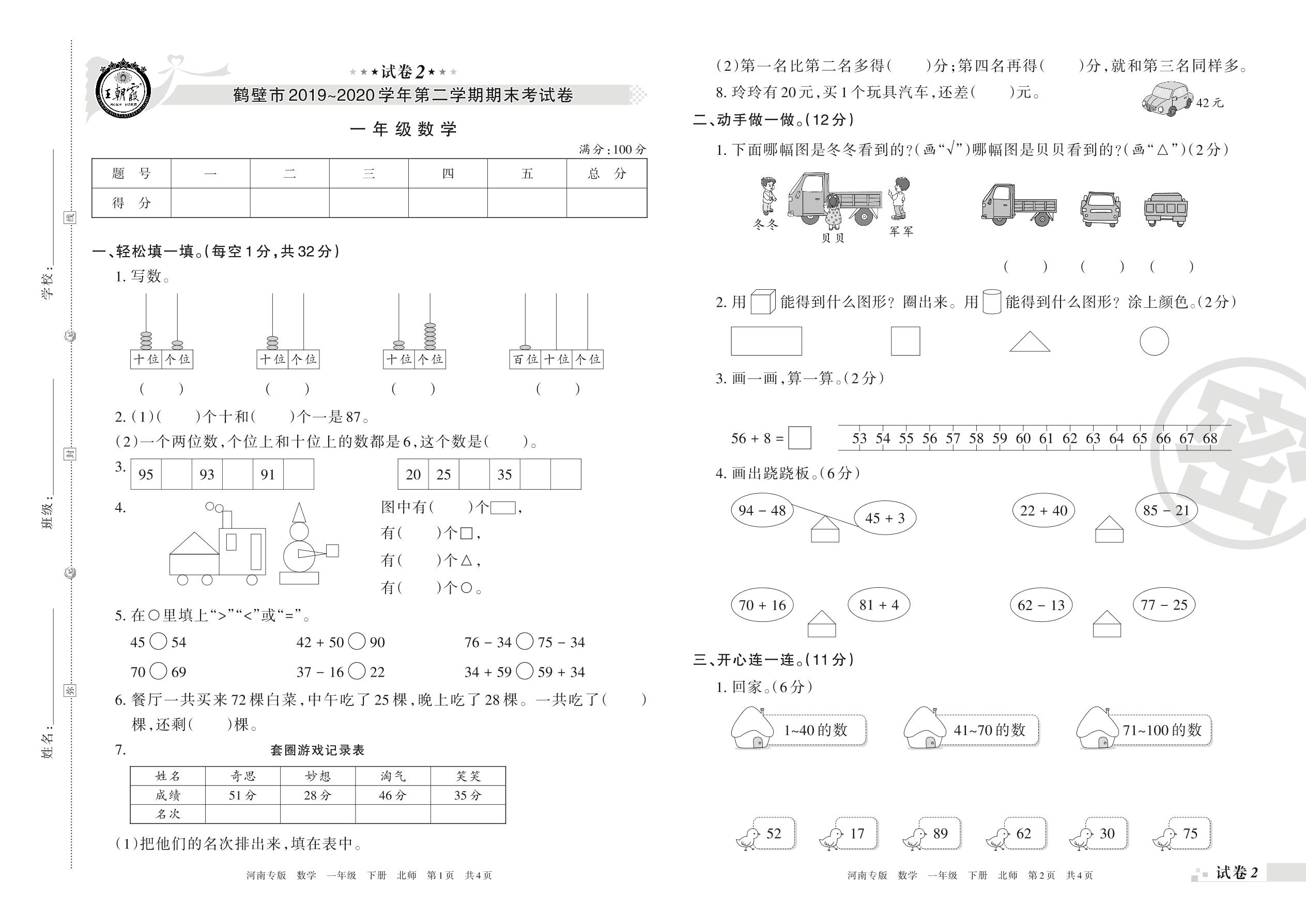 2019-2020学年第二学期鹤壁市一年级数学试卷(北师版)【2】