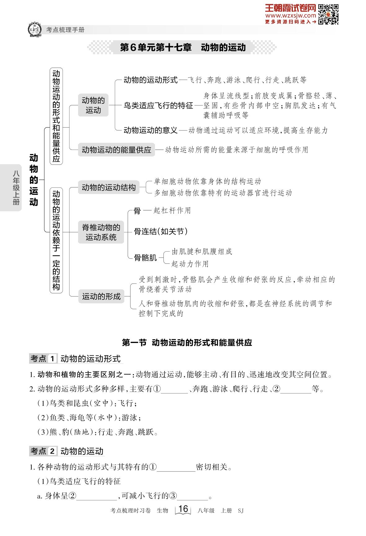 2023上册八年级生物苏教版 考点梳理手册——第6单元第十七章 动物的运动