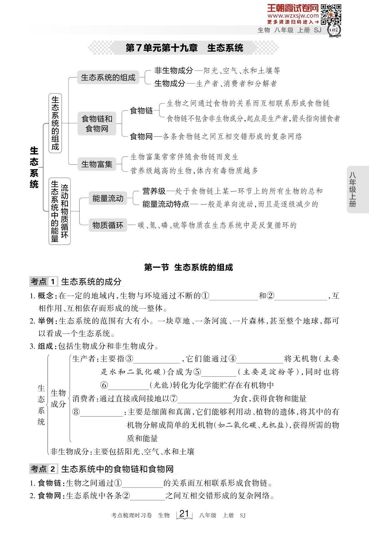 2023上册八年级生物苏教版 考点梳理手册——第7单元第十九章 生态系统