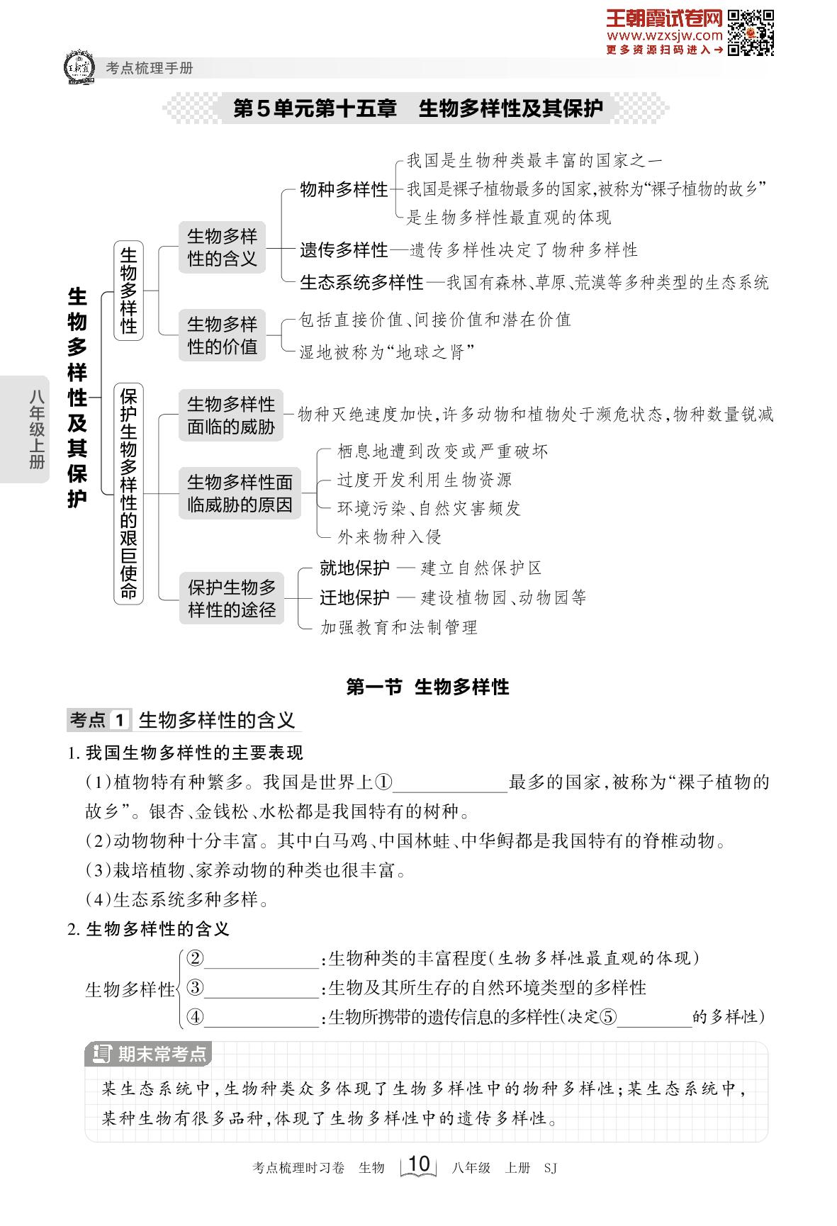 2023上册八年级生物苏教版 考点梳理手册——第5单元第十五章 生物多样性及其保护