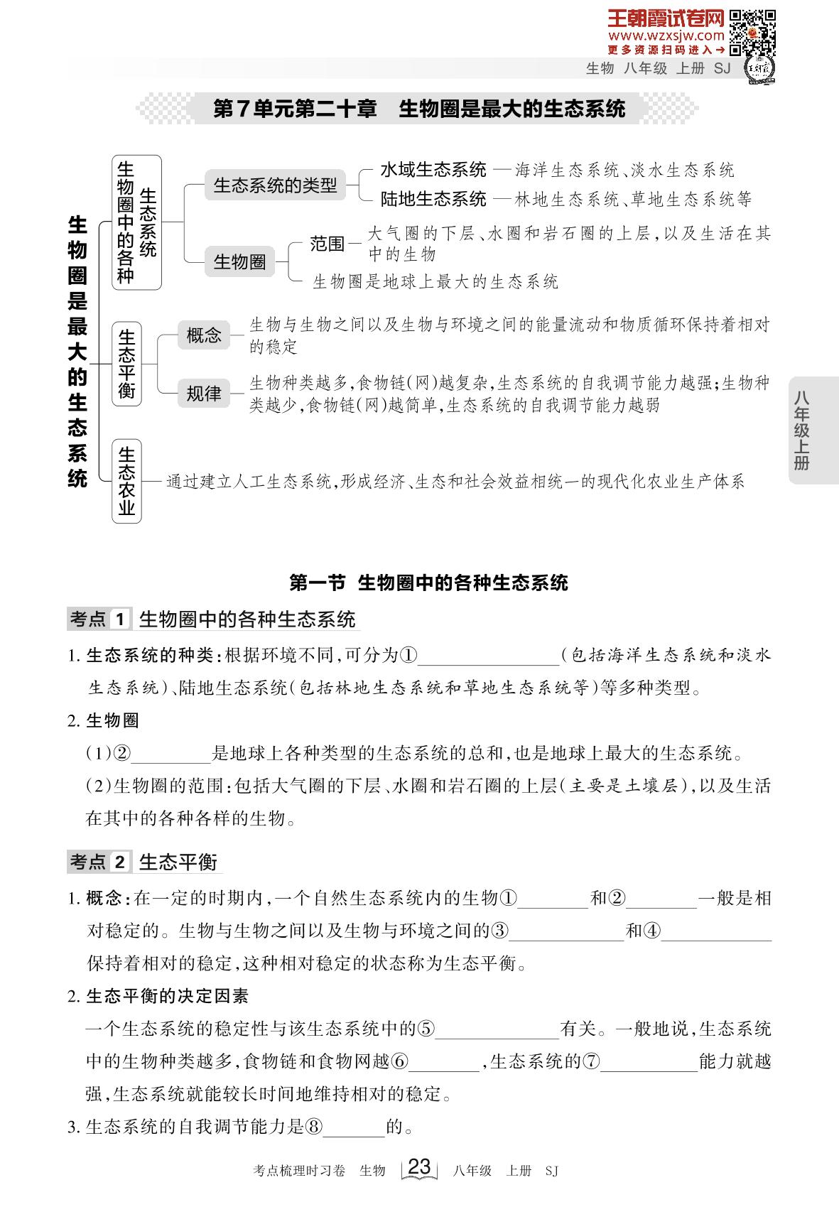 2023上册八年级生物苏教版 考点梳理手册——第7单元第二十章 生物圈是最大的生态系统