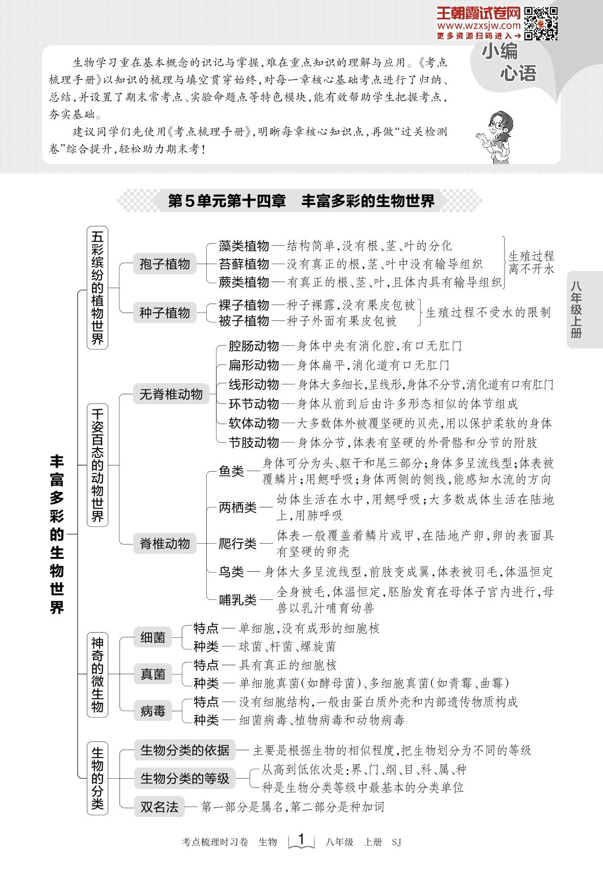 2023上册八年级生物苏教版 考点梳理手册——第5单元第十四章 丰富多彩的生物世界