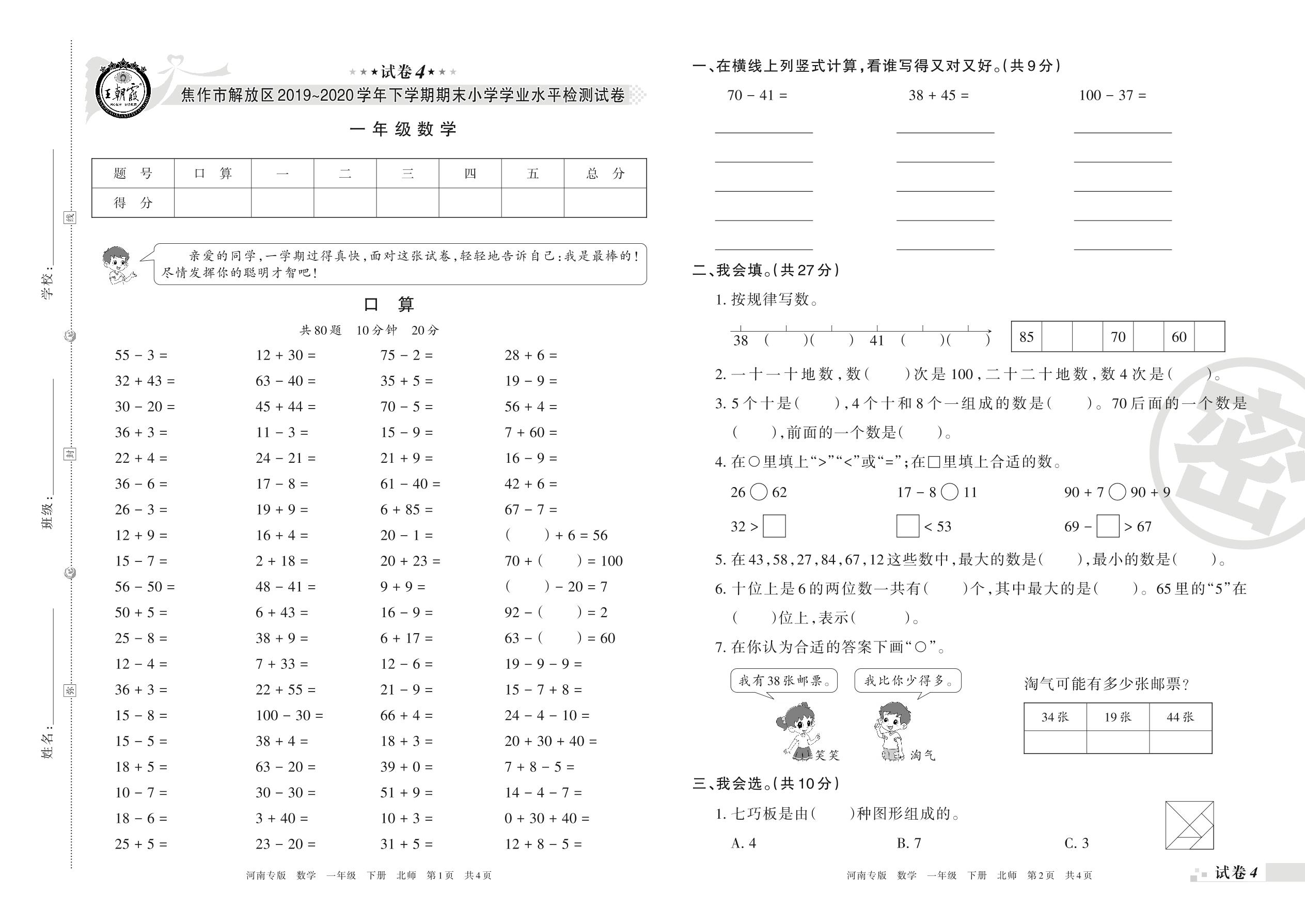 2019-2020学年第二学期焦作市解放区一年级数学试卷(北师版)【4】