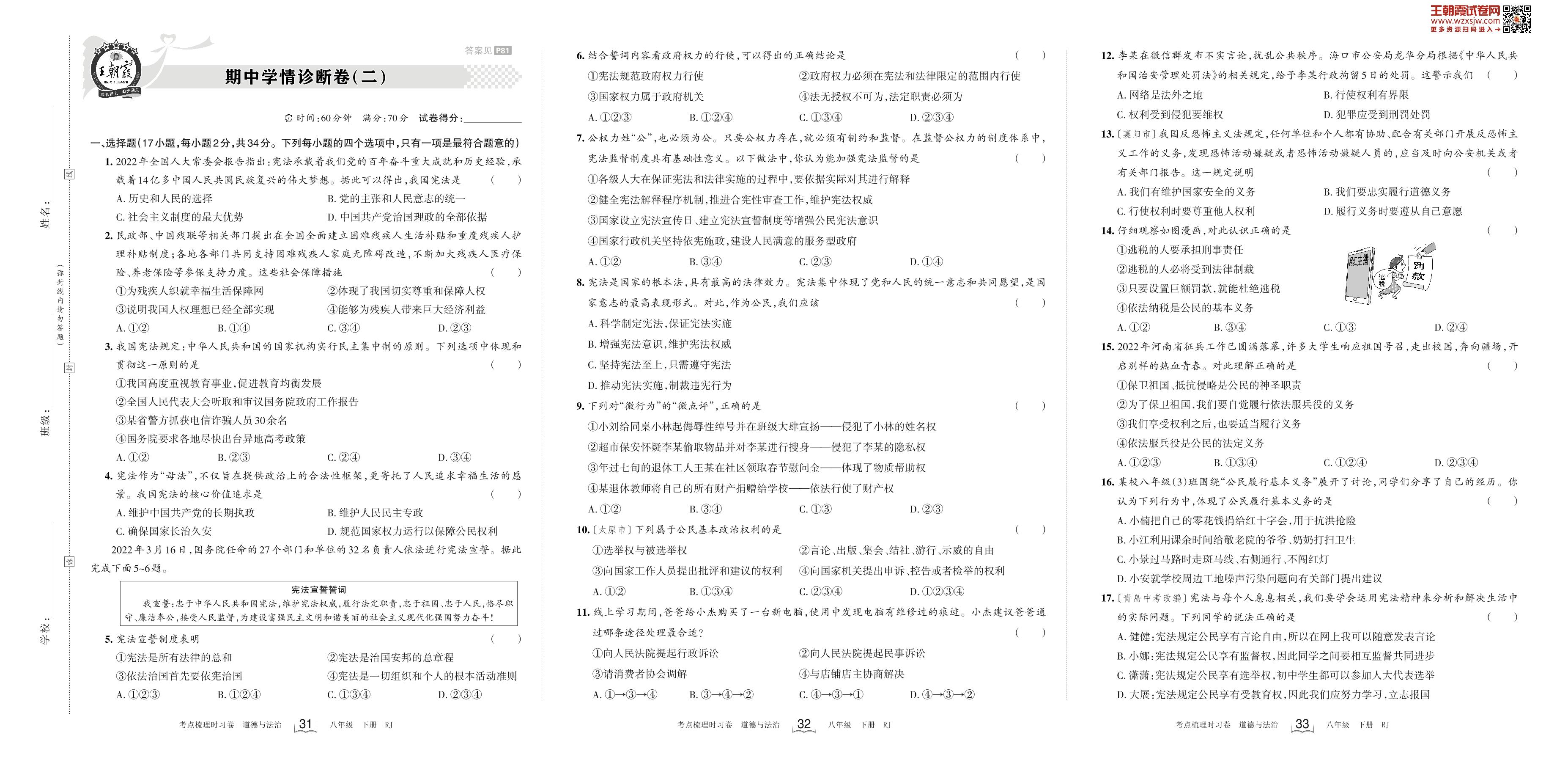 2023下册八年级道德与法治人教版 期中学情诊断卷(二)