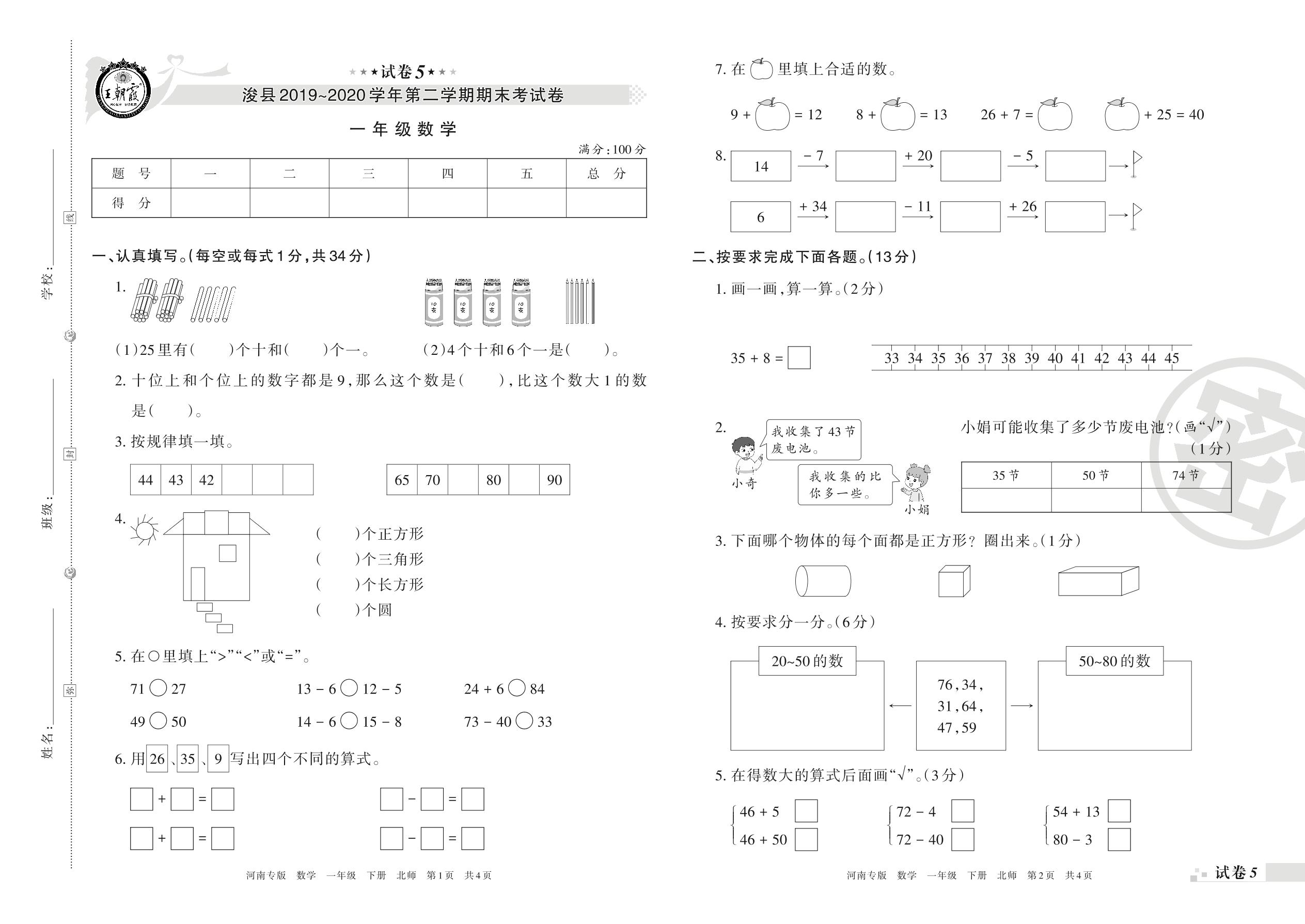 2019-2020学年第二学期鹤壁市浚县一年级数学试卷(北师版)【5】