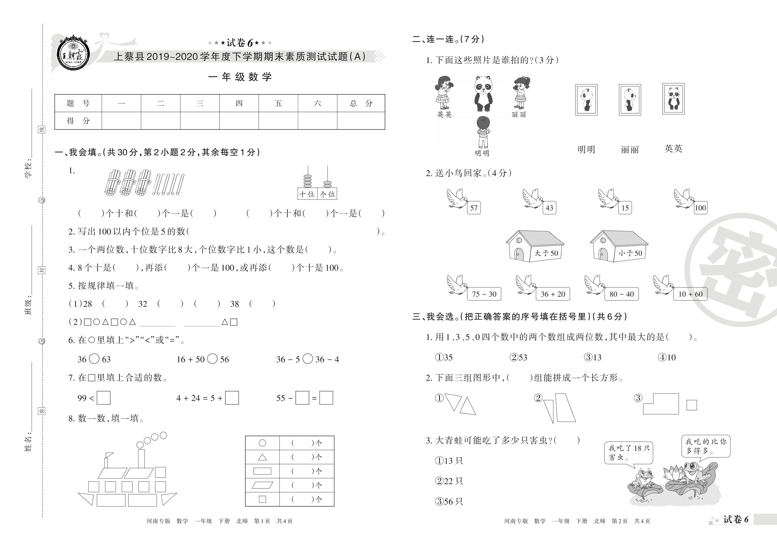 2019-2020学年第二学期驻马店市上蔡县一年级数学试卷(北师版)【6】