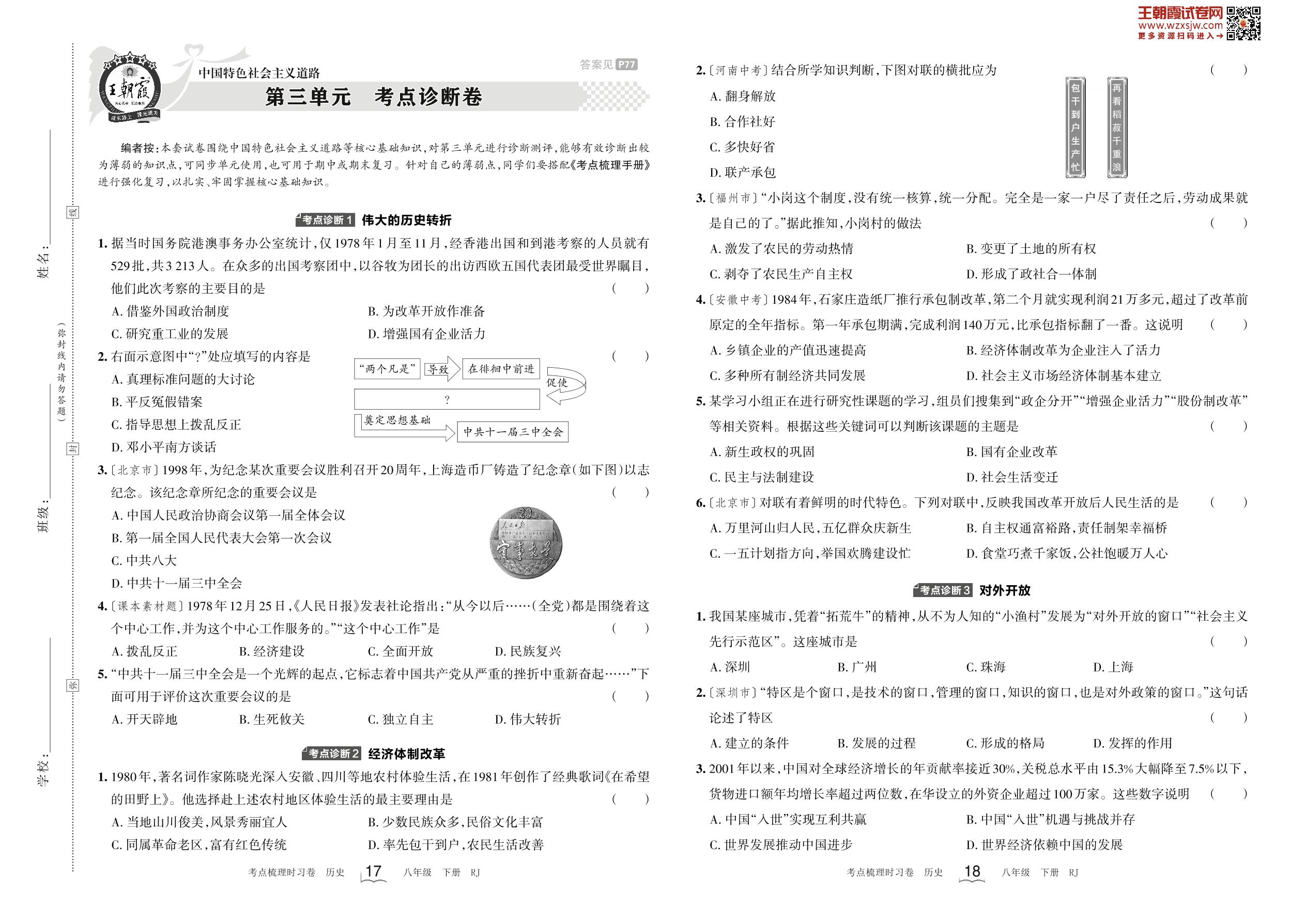 2023下册八年级历史人教版 第三单元 考点诊断卷