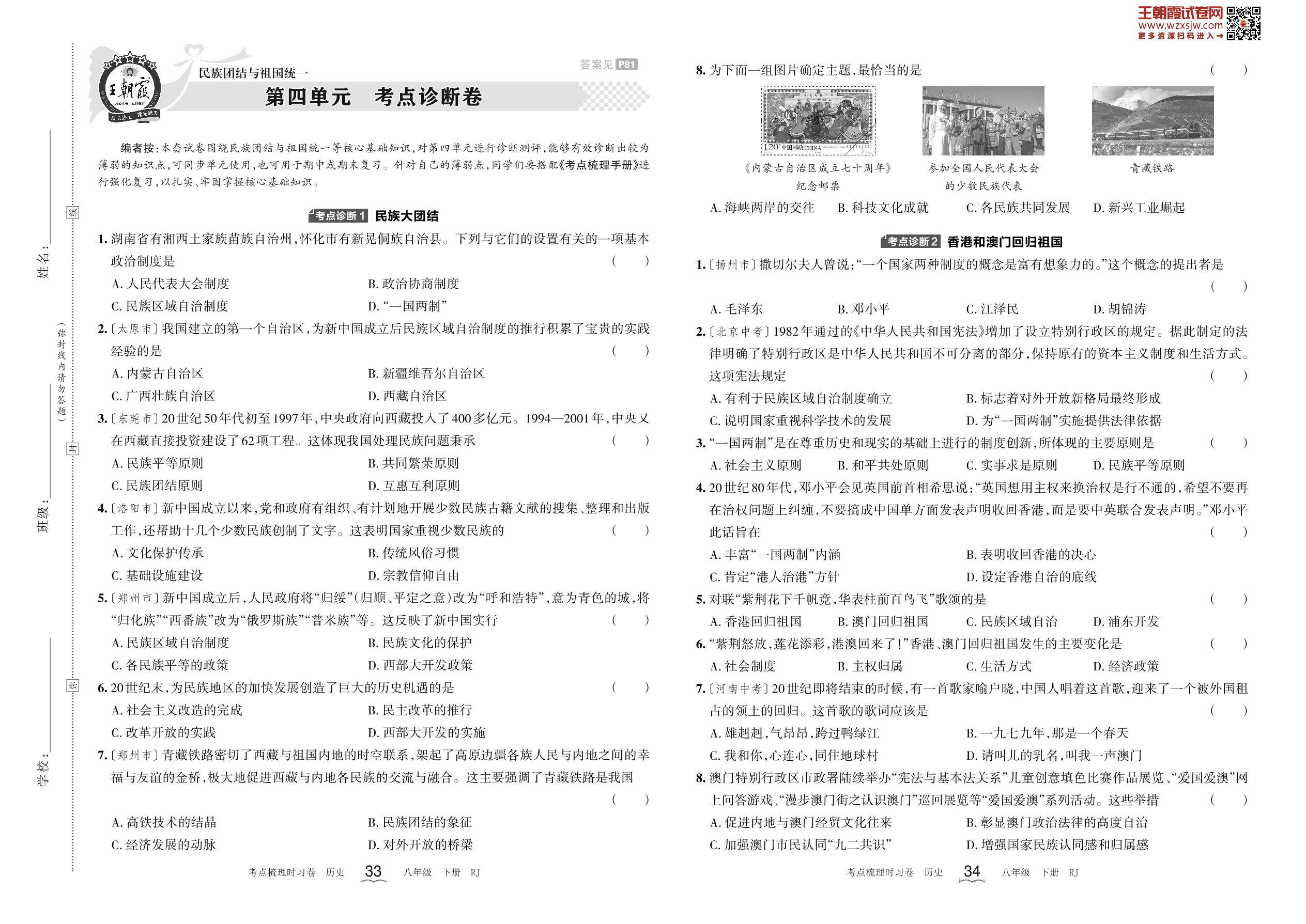 2023下册八年级历史人教版 第四单元 考点诊断卷