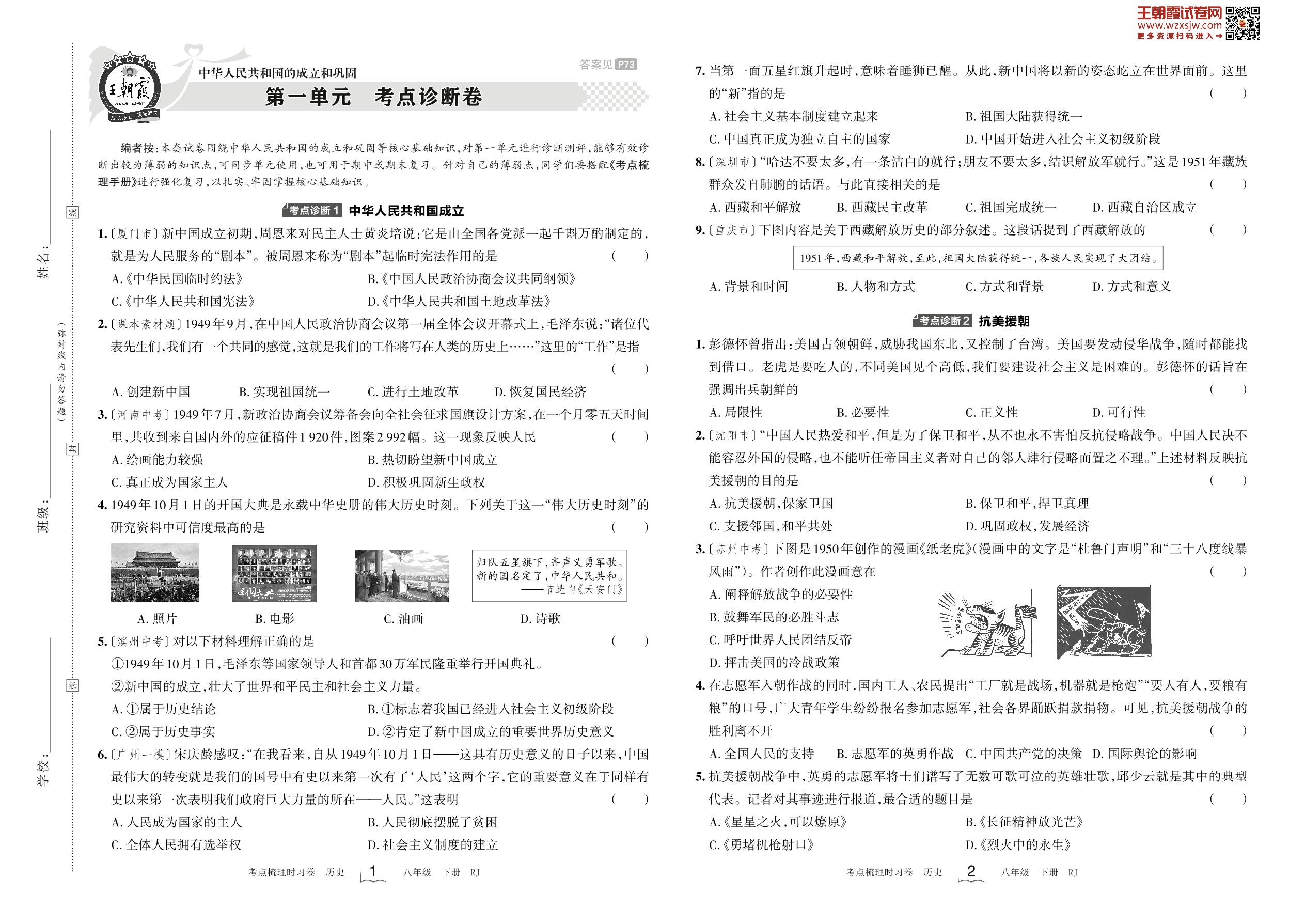 2023下册八年级历史人教版 第一单元 考点诊断卷