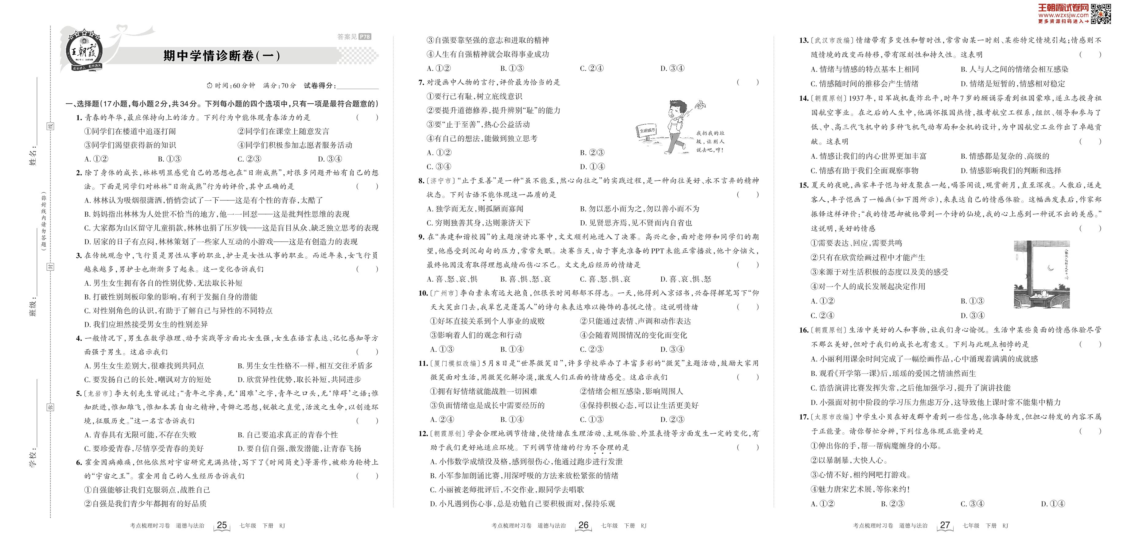 2023下册七年级道德与法治人教版 期中学情诊断卷(一)