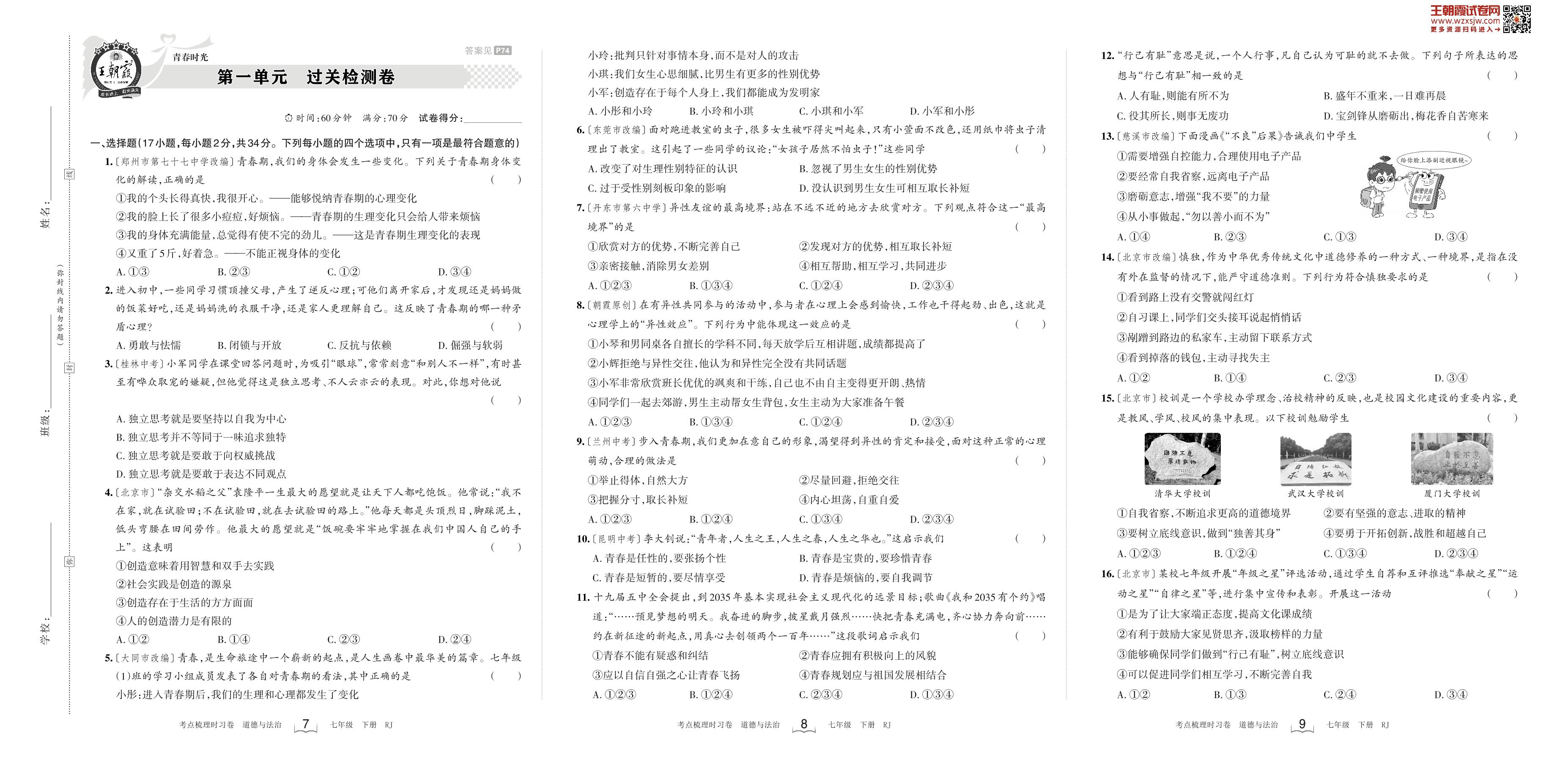 七年级道德与法治人教版下册单元卷