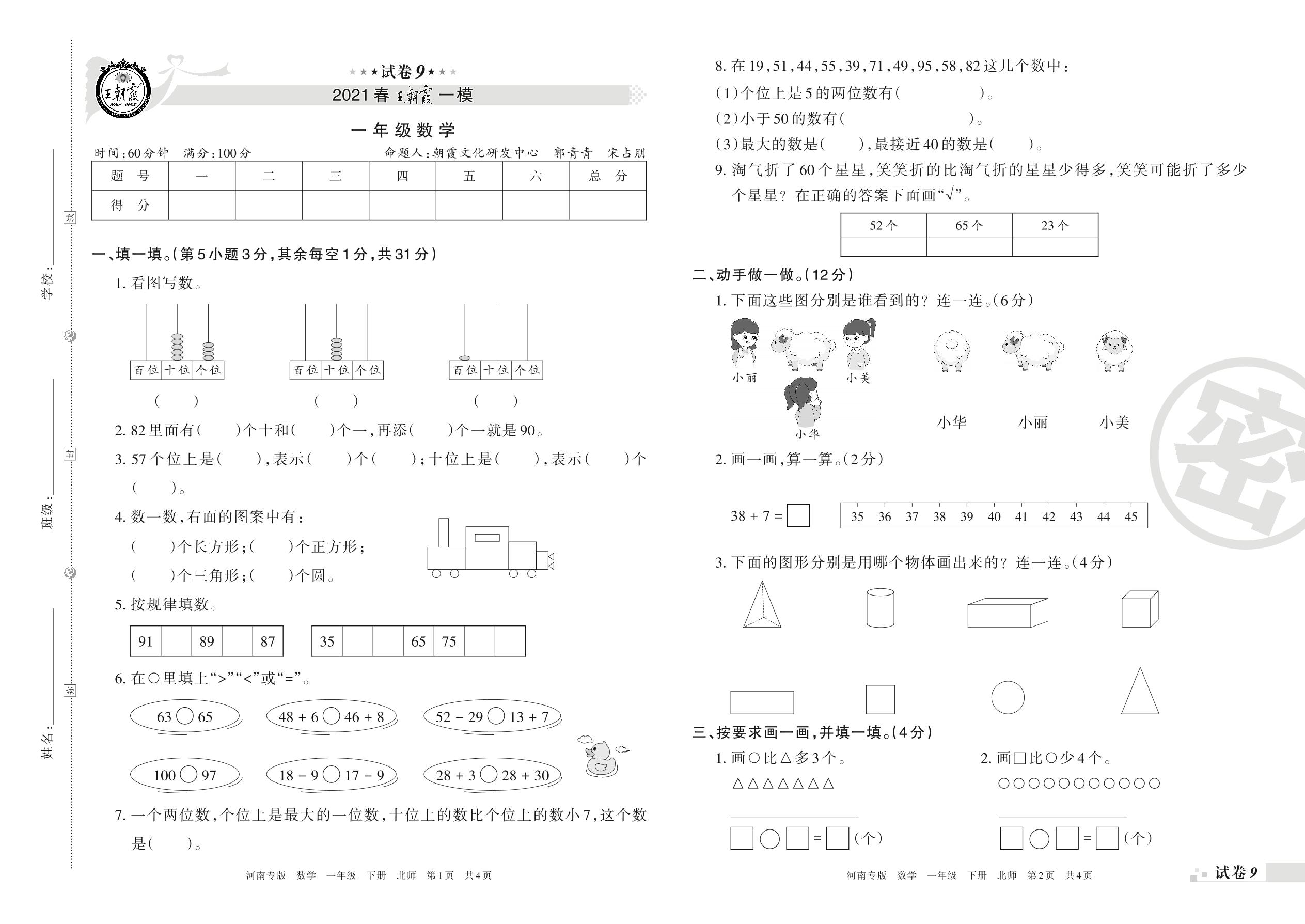 王朝霞期末模拟卷一年级下册数学(北师版)_R210802210509【9】