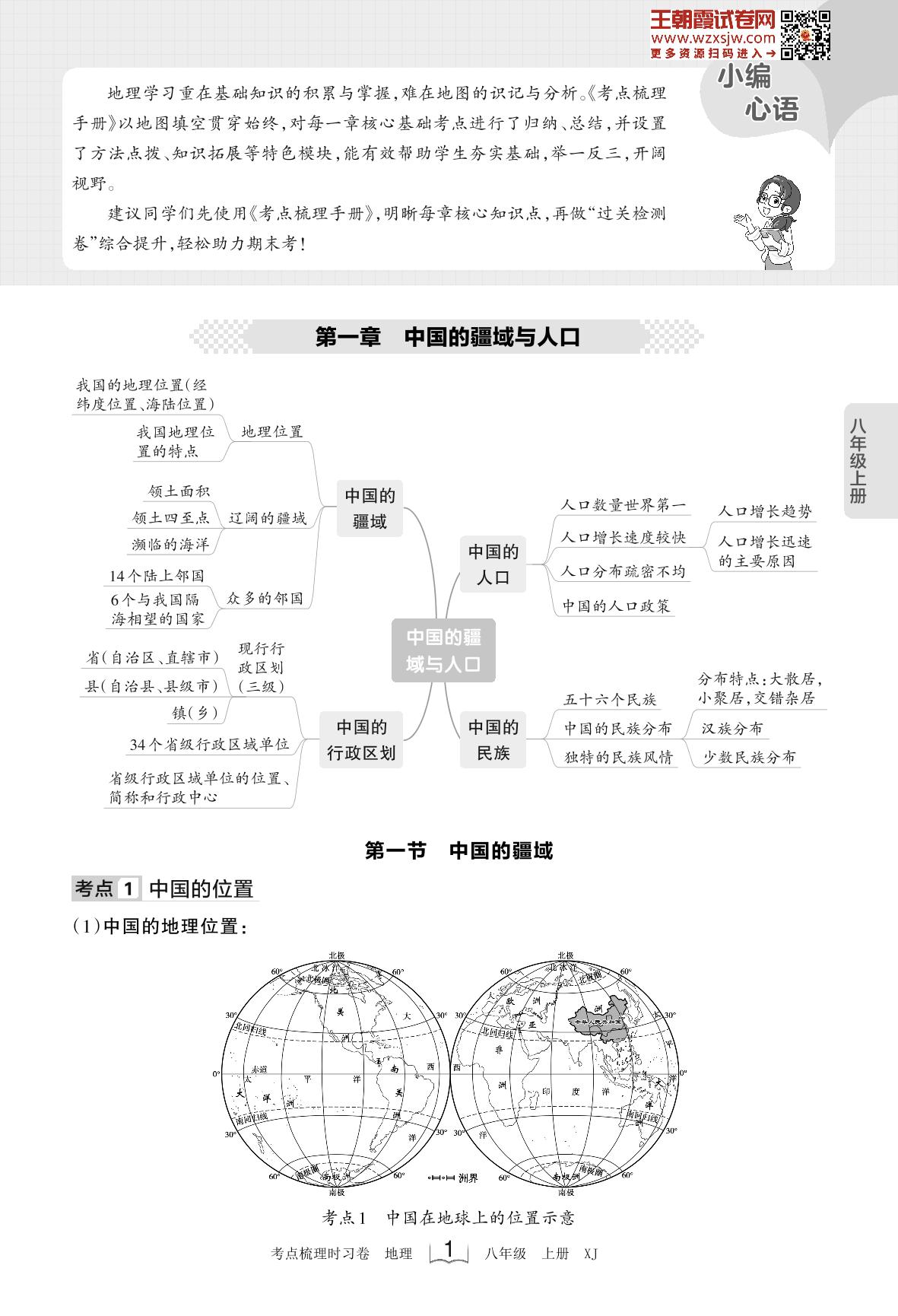 2023上册八年级地理湘教版 考点梳理手册——第一章 中国的疆域与人口