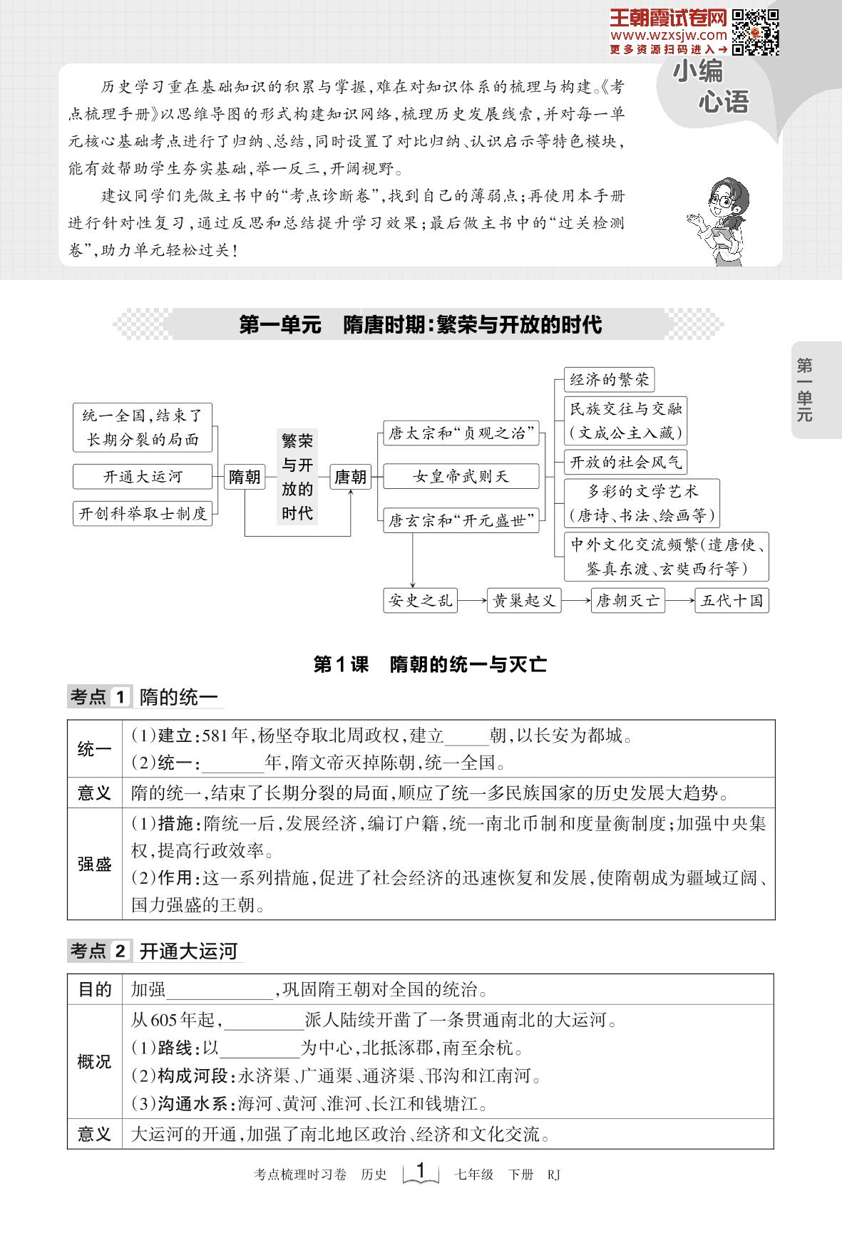 2023下册七年级历史人教版 考点梳理手册——第一单元 隋唐时期:繁荣与开放的时代