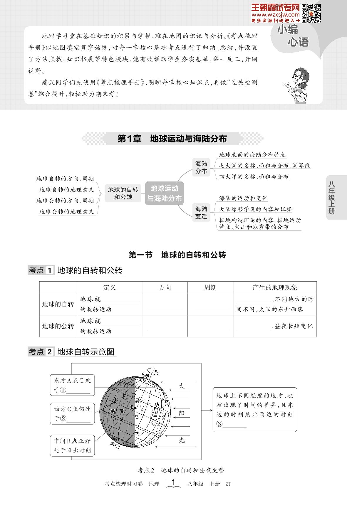 2023上册八年级地理中图版 考点梳理手册——第1章 地球运动与海陆分布