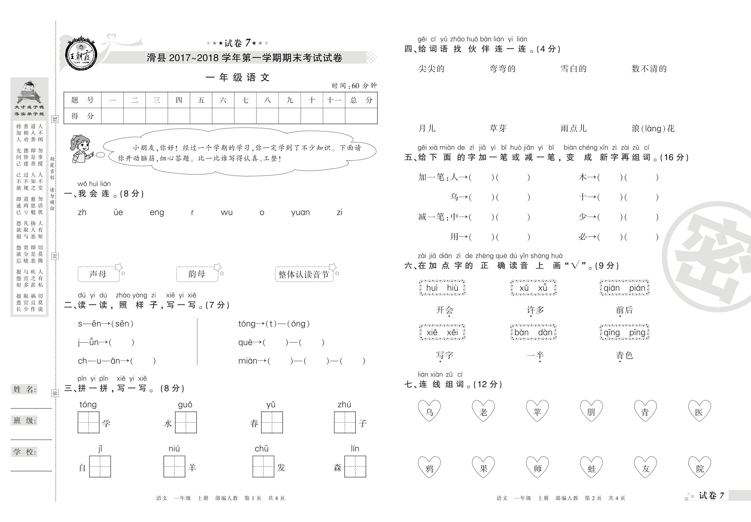 2017-2018学年第一学期安阳市滑县一年级语文试卷(人教版)【7】